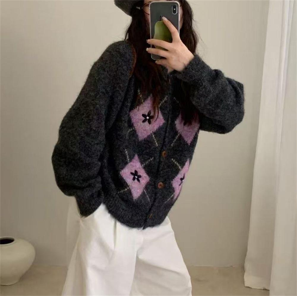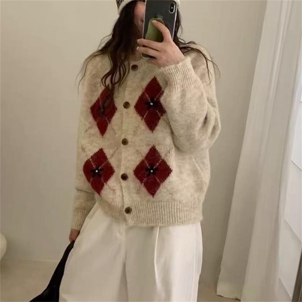 Женский корейский вязаный кардиган в клетку аргайл: Ретро свитер с круглым вырезом на осень/зиму