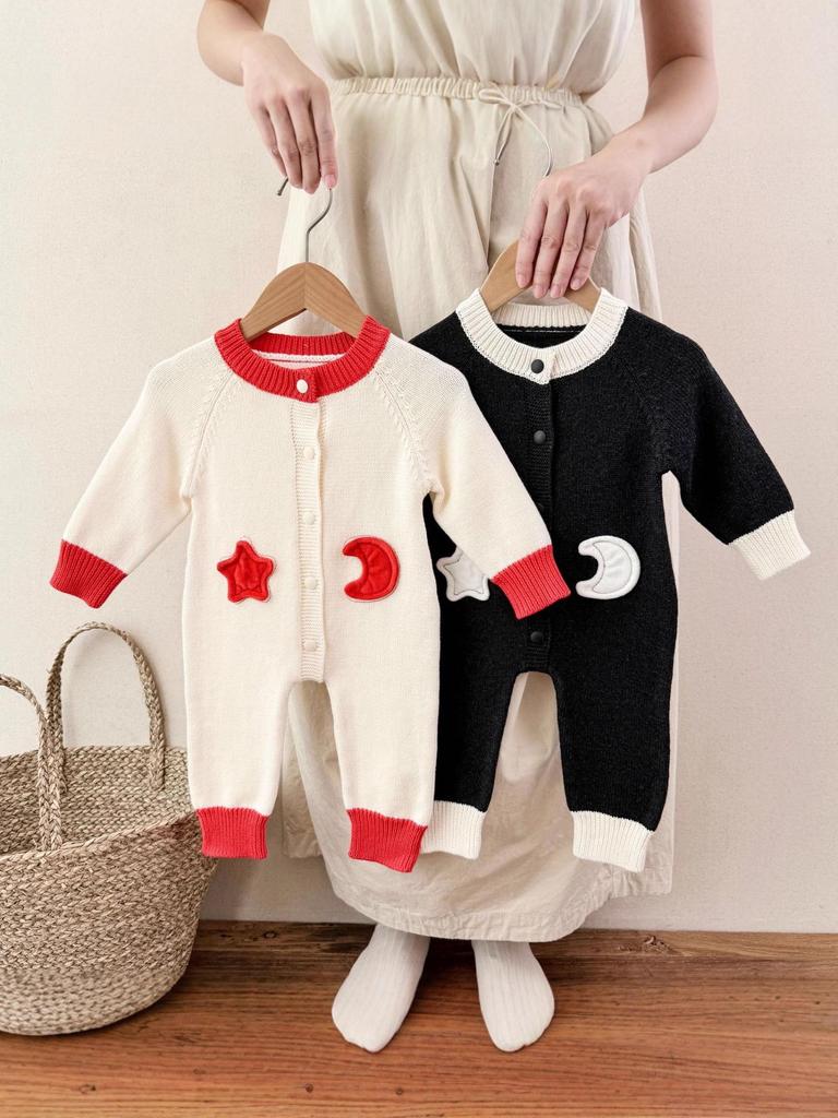 Knitted Romper with 3D Stars & Moon for Infants & Toddlers - Cute Spring & Autumn Crawling Suit for Boys & Girls