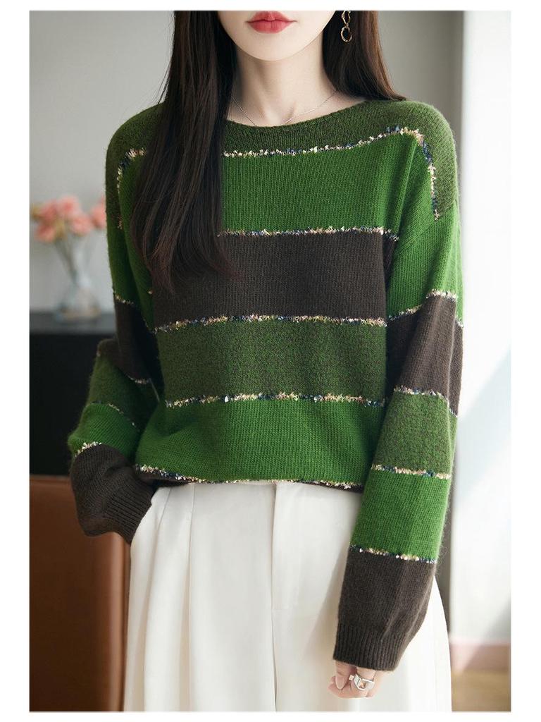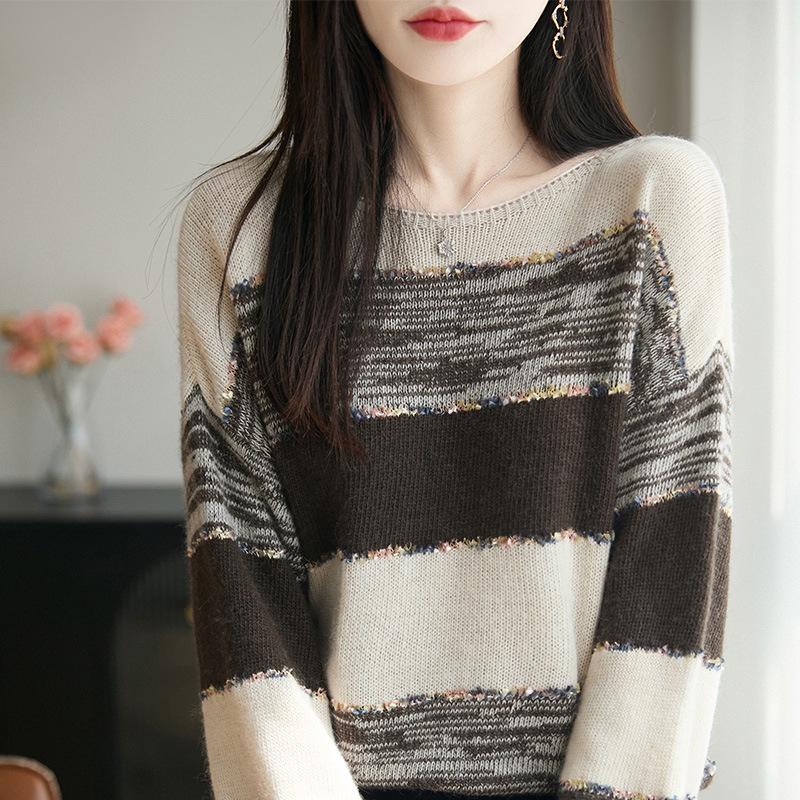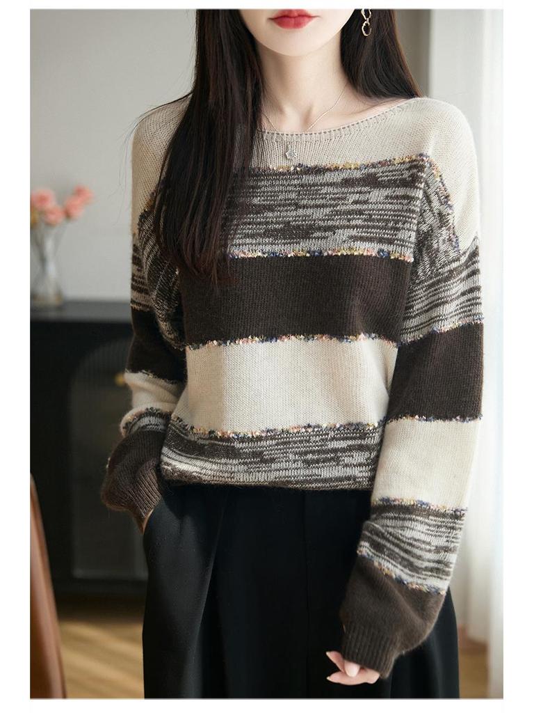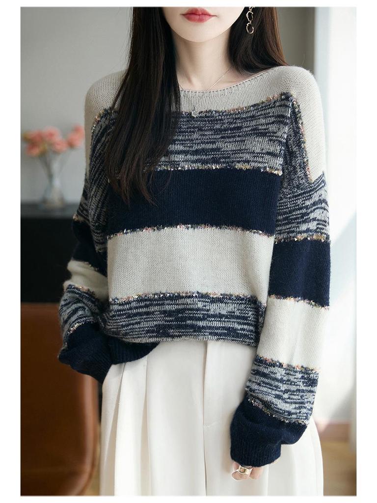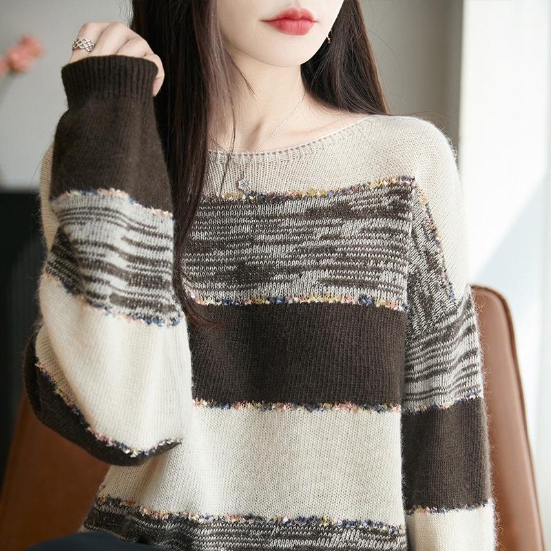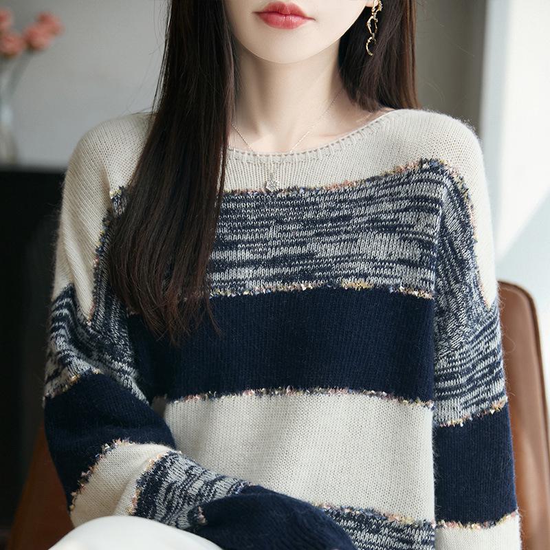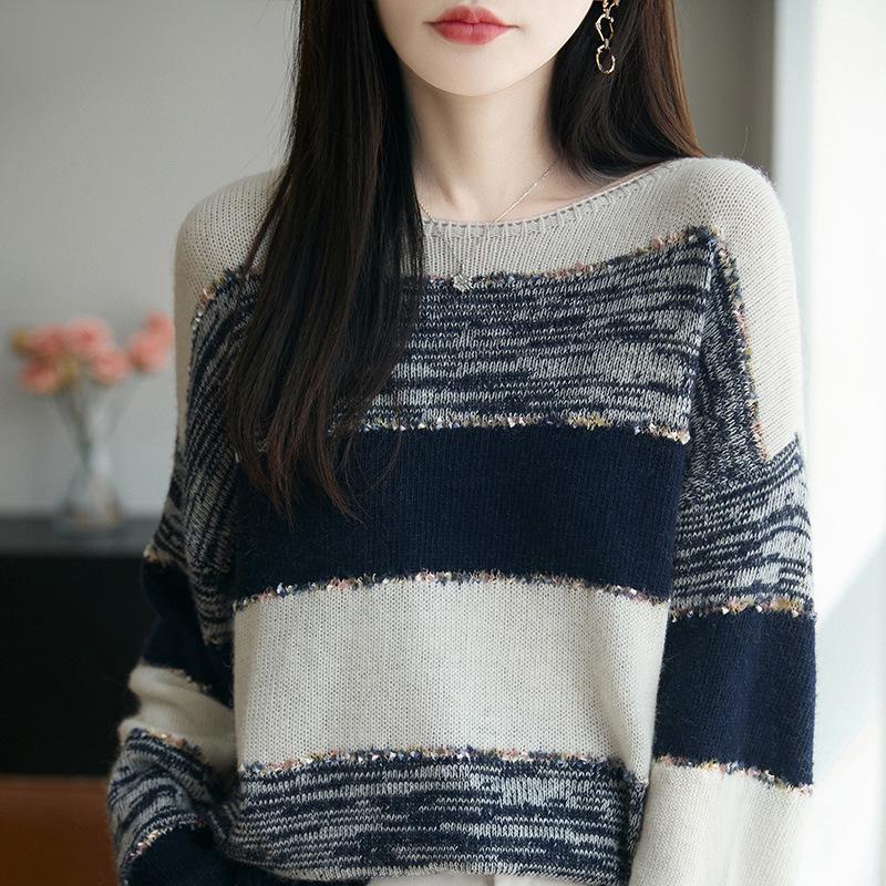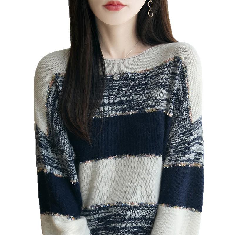 Женский вязаный свитер большого размера с цветными блоками и полосками, с круглым вырезом, с длинным рукавом, свободного кроя для осени/зимы.