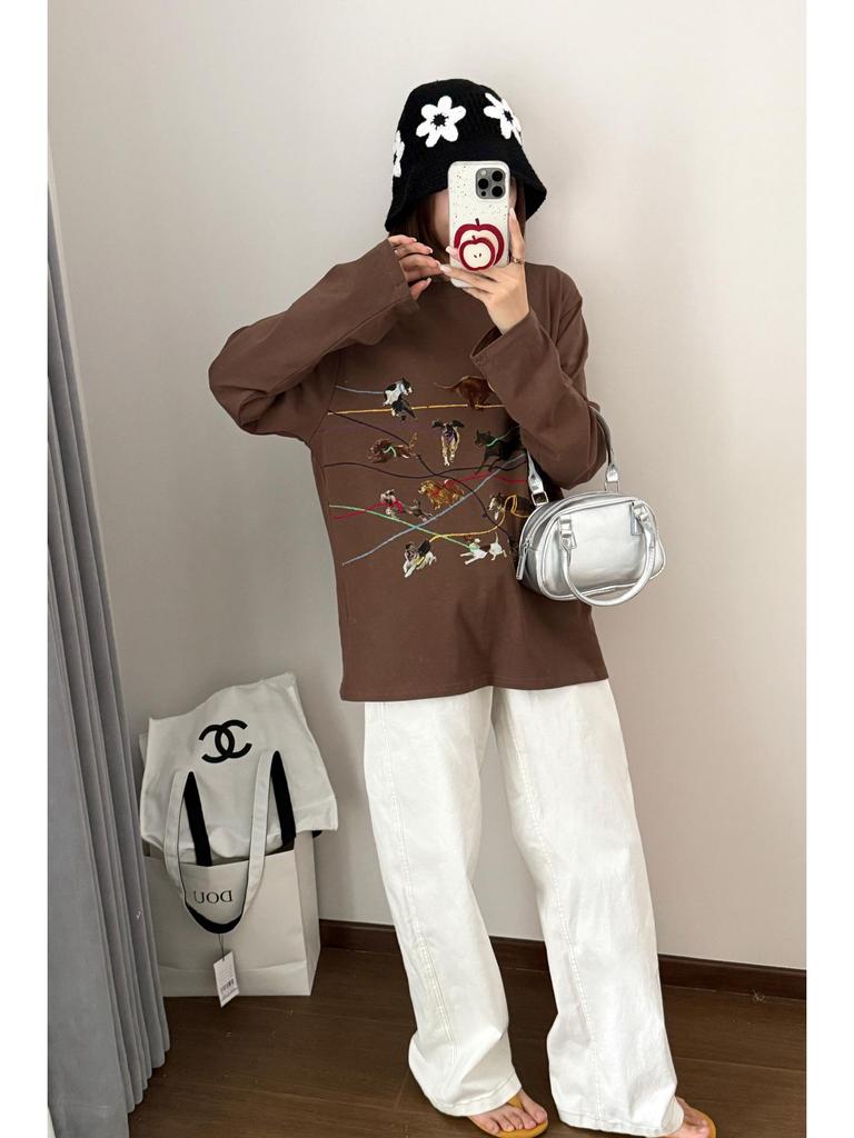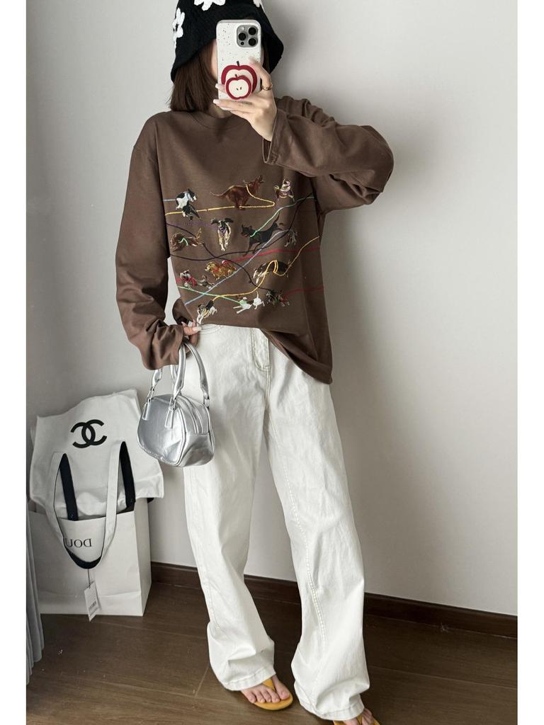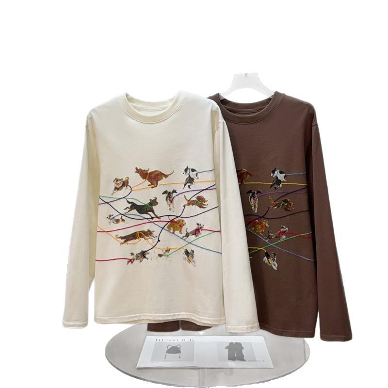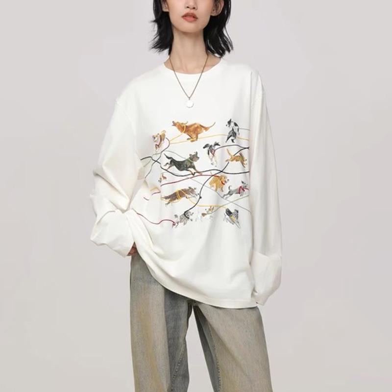 ID Осенняя футболка с длинным рукавом и вышивкой с принтом ретро-щенка