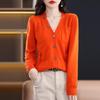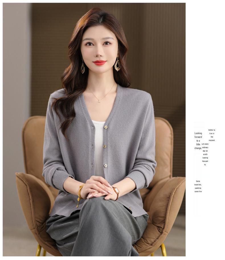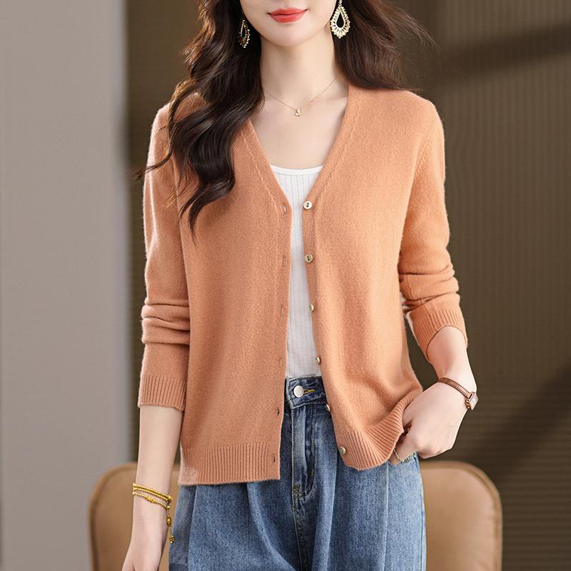 Женский кардиган из 100% шерсти с V-образным вырезом - Весна/Осень 2025, Длинный рукав, Маленький размер, Легкий свитер