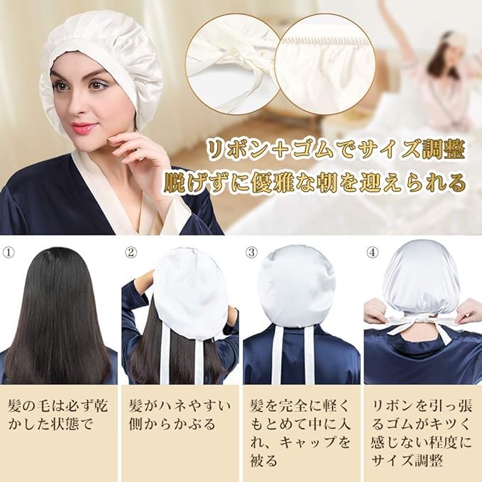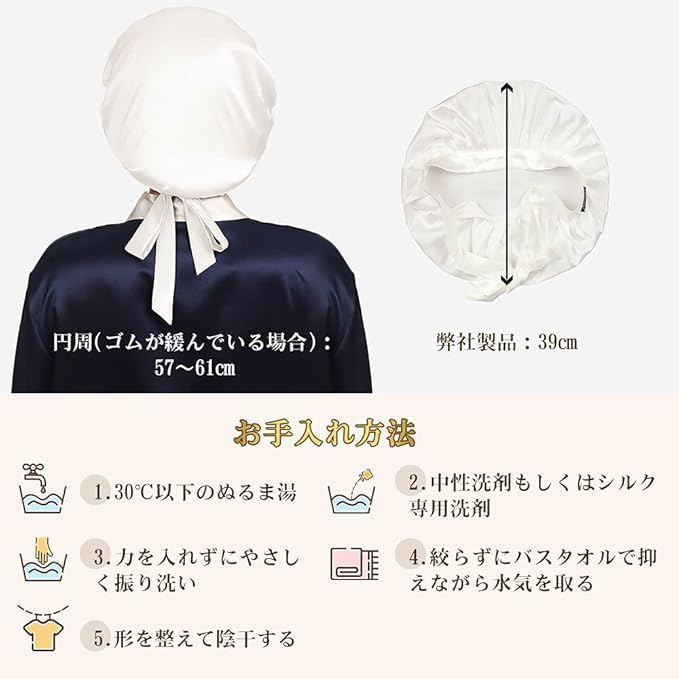 [Почему выбирают шелк?] Шелк обладает множеством полезных свойств для кожи человека. Помогает предотвратить сухость кожи головы и волос. Шелковая ночная шапочка помогает предотвратить спутывание и ломкость волос во время сна.. Просто надев его во время сна, можно легко улучшить качество волос, ухаживать за волосами и ухаживать за кожей головы, сокращая время на уход.
