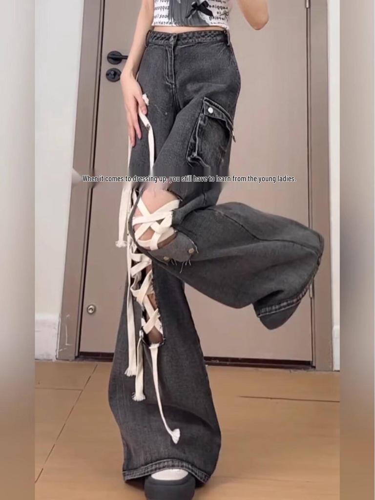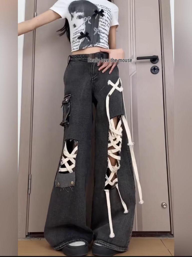 Представляем наши стильные и удобные женские джинсы больших размеров черного цвета со шнуровкой, высокой посадкой, рваные, с широкими штанинами.. Изготовленные из высококачественного денима, эти джинсы имеют льстящую высокую посадку и модные рваные детали.. Уникальный дизайн со шнуровкой добавляет нотку дерзости, а широкий крой брюк создает расслабленный и шикарный силуэт.. Идеальные для любого повседневного случая, эти джинсы легко сочетают моду и комфорт, что делает их незаменимым дополнением к вашему гардеробу.