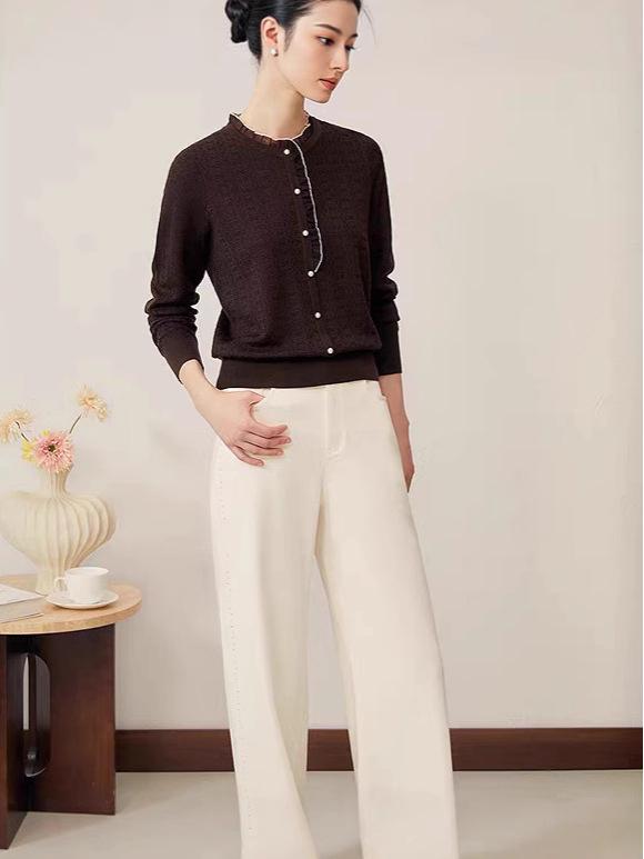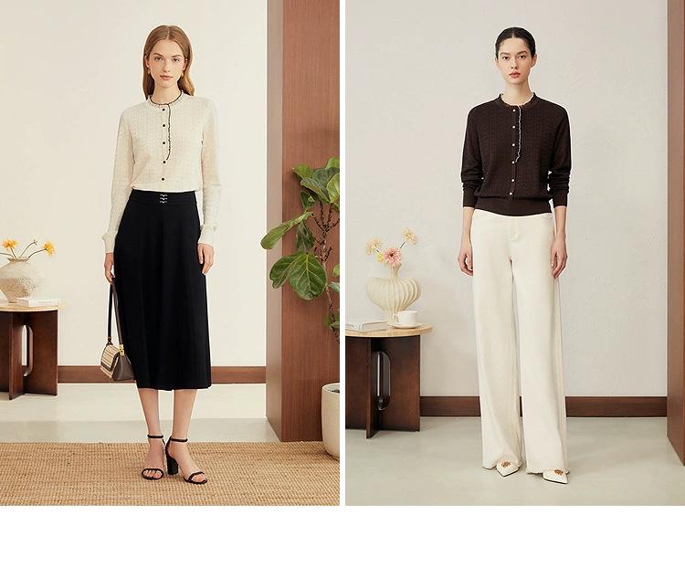Ощутите воплощение осенней элегантности с этим высококачественным женским вязаным свитером.. Этот свитер, изготовленный из премиальной шерстяной смеси и акрила, демонстрирует изысканный однотонный узор и удобную свободную посадку.. С круглым вырезом и шикарной отделкой оборками, он добавляет нотку женственности любому ансамблю.. Его длинные рукава делают его идеальным выбором для тех прохладных осенних дней, а тонкая толщина обеспечивает легкую многослойность для универсального стиля.. Идеально для тех, кто ценит роскошный комфорт и стиль.