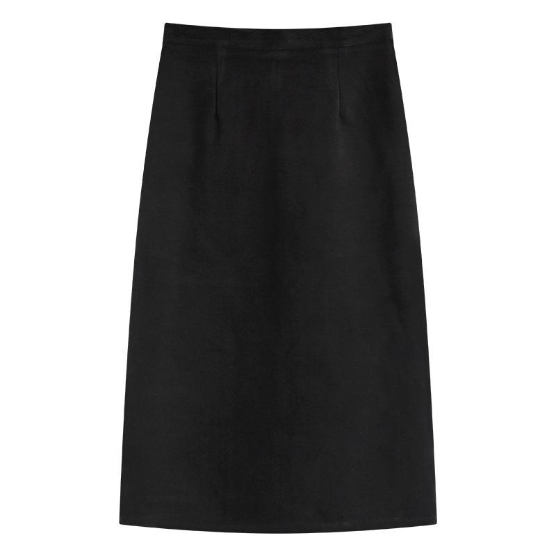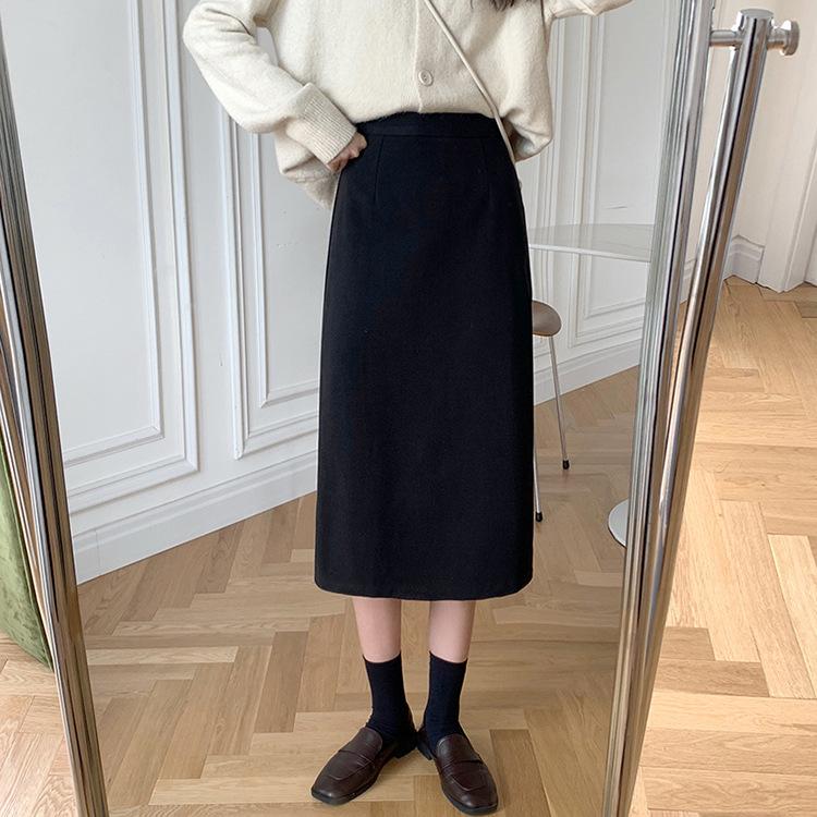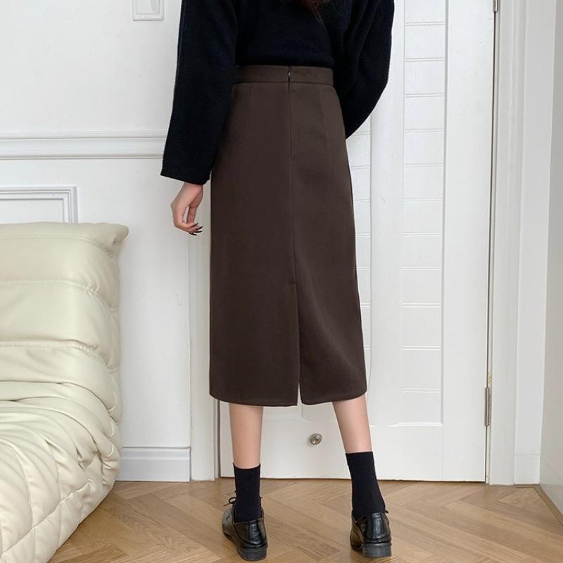 Осень Зима Шерсть Коричневая Юбка Элегантная С Завышенной Талией Облегающая С Разрезом Сзади Миди Облегающая А-силуэт