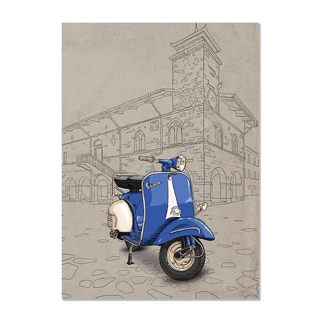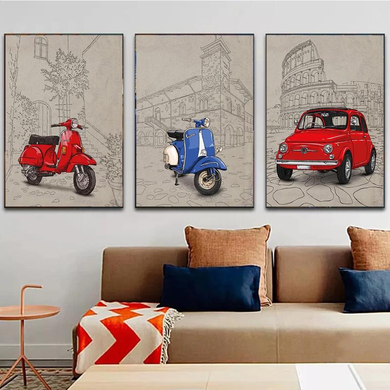 Итальянский стиль Знаменитое здание Фон Fiat 500 Красный Желтый Веспа Постер Принт Настенное искусство Картина Холст Живопись Комната Домашний декор