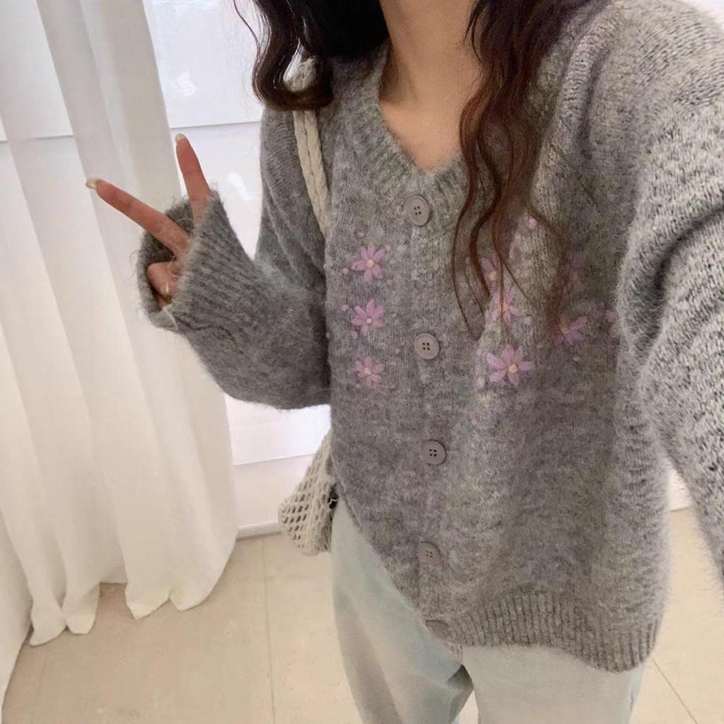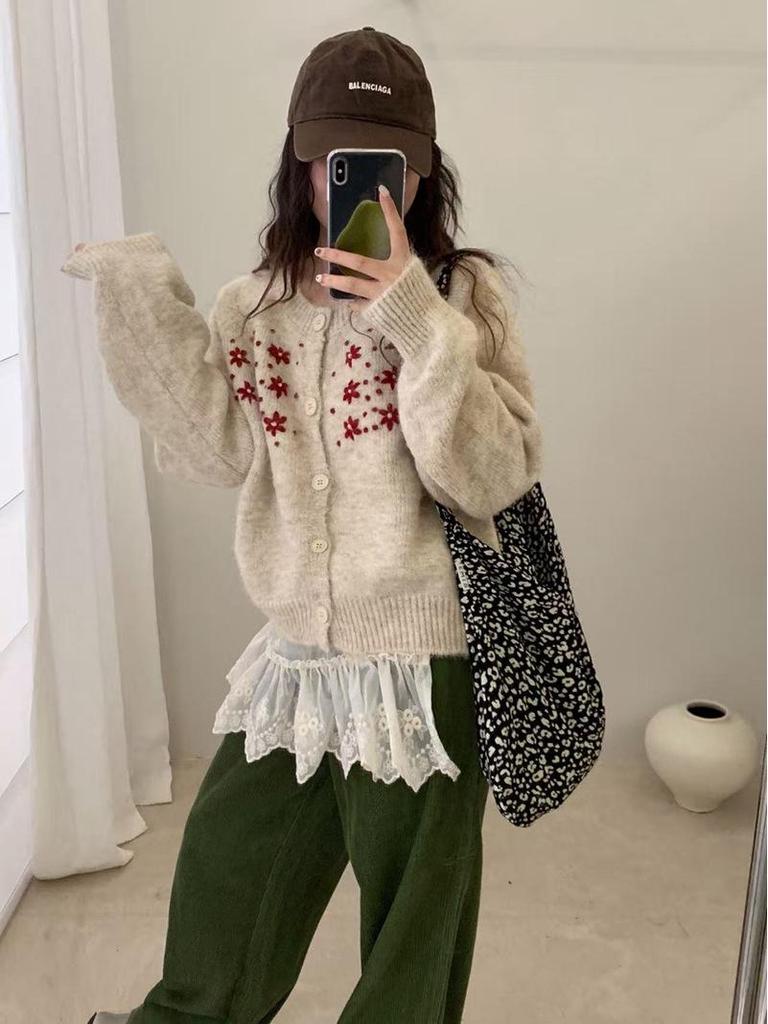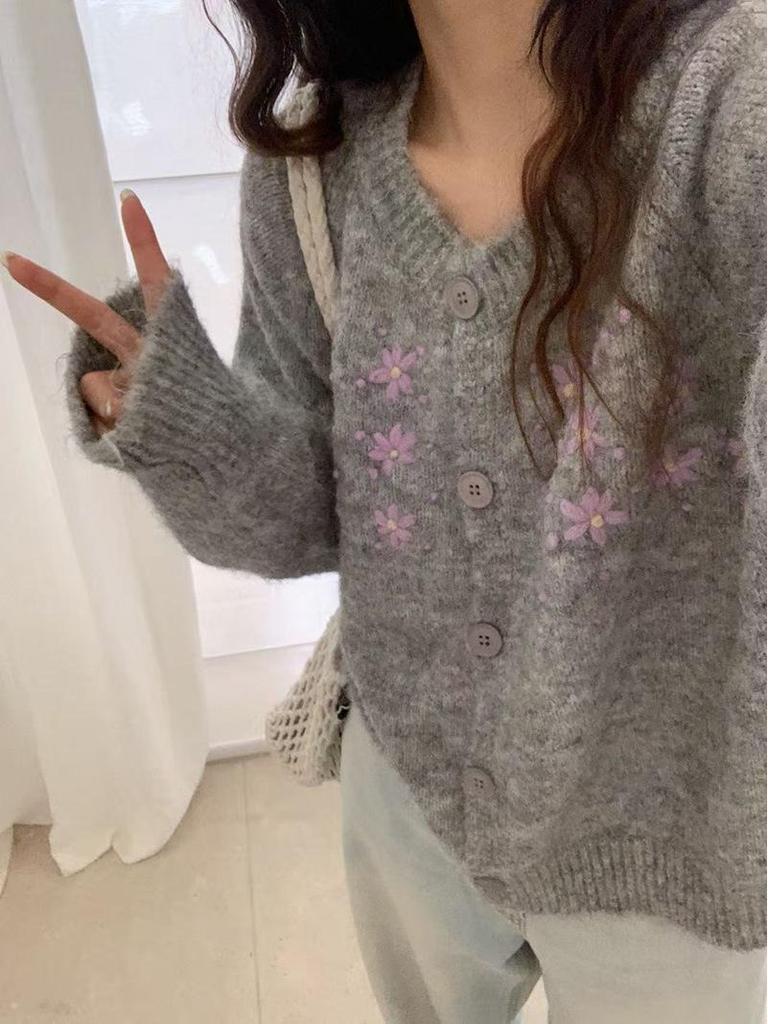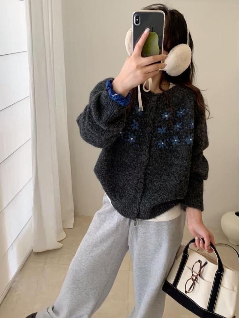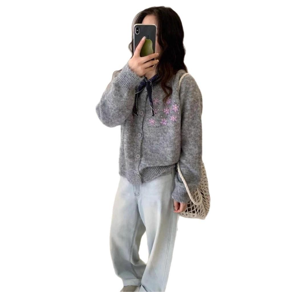Женский вязаный кардиган свободного кроя в корейском стиле на осень 2025 года с вышитым дизайном