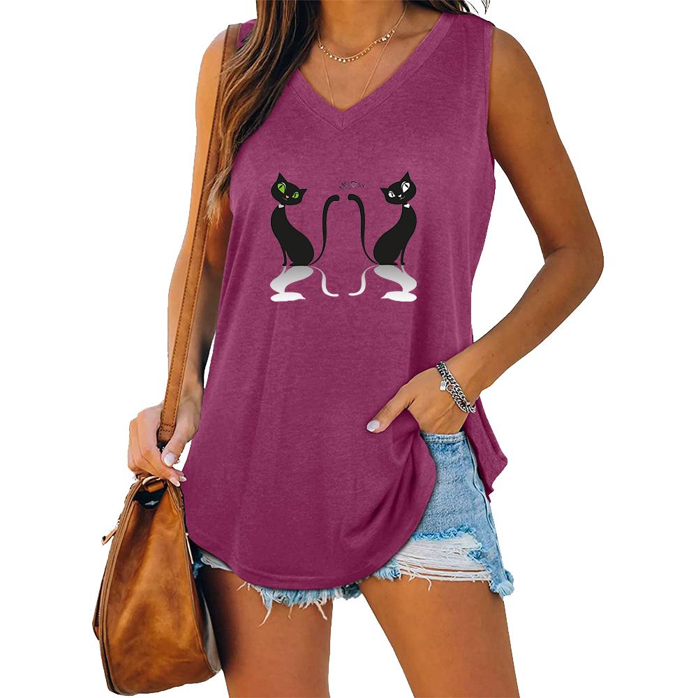 Женская модная футболка с V-образным вырезом без рукавов Женский повседневный танк-топ с принтом кошки
