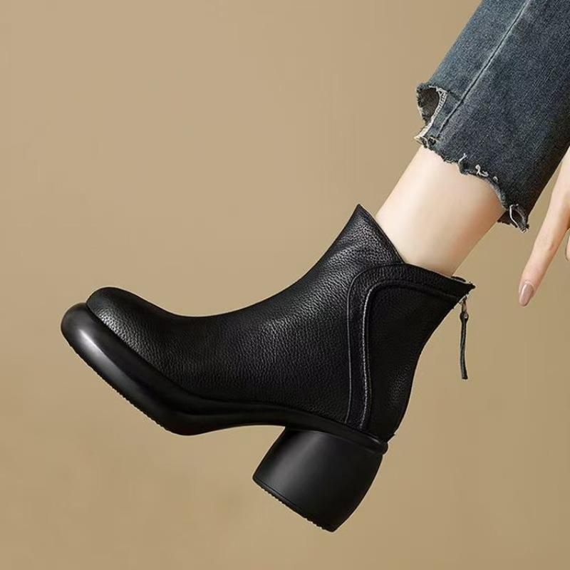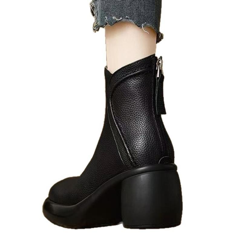Ретро обувь с флисом, Высокие каблуки, Толстые каблуки, Короткие ботинки, Женская обувь на толстой подошве, Обувь на мягкой подошве, Ботинки телесного цвета