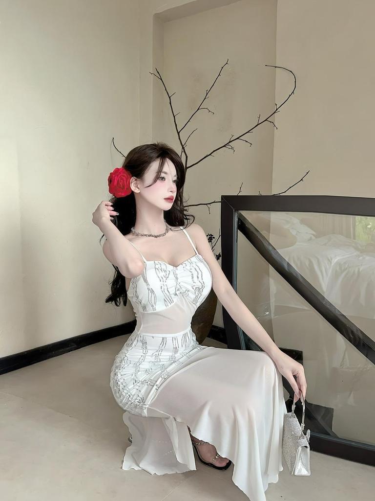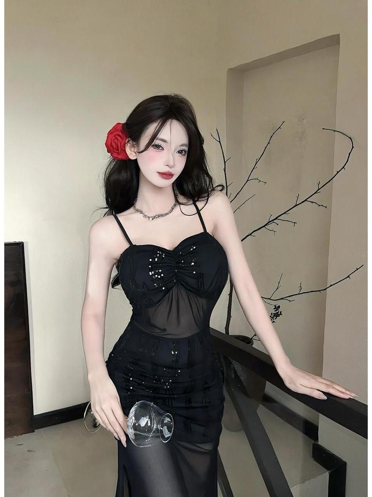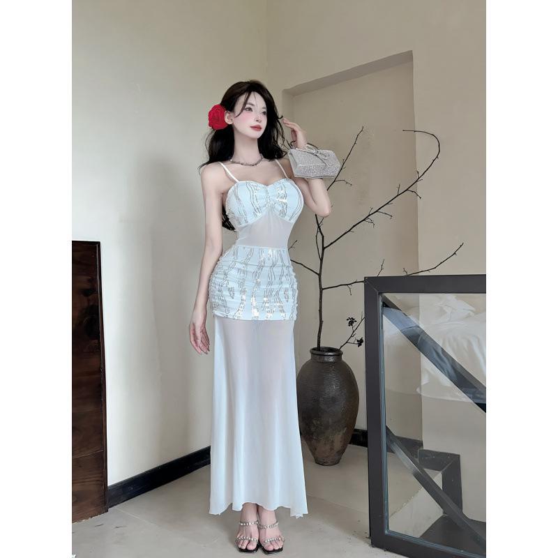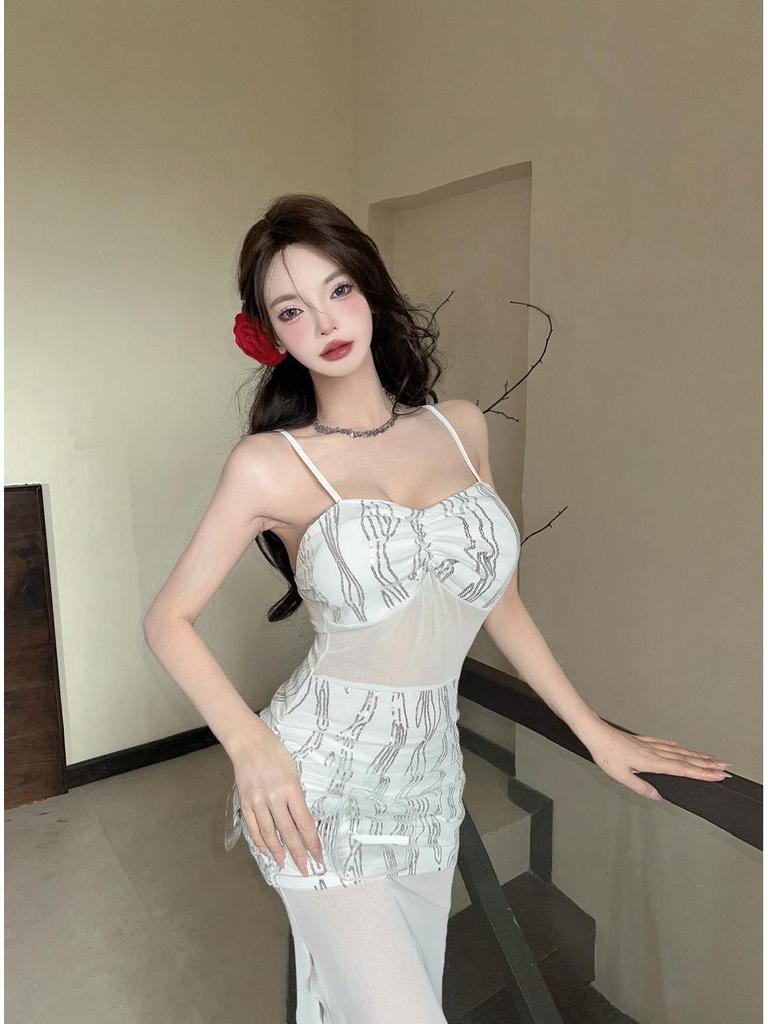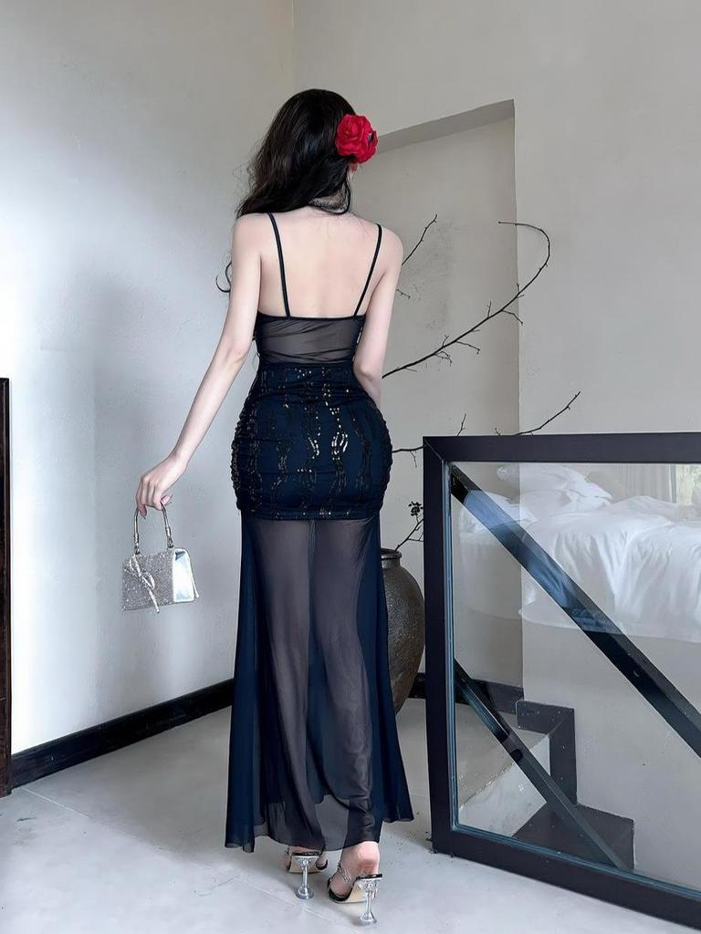 Сексуальное облегающее платье миди на тонких бретелях из сетки - Полупрозрачное, с вырезами на талии