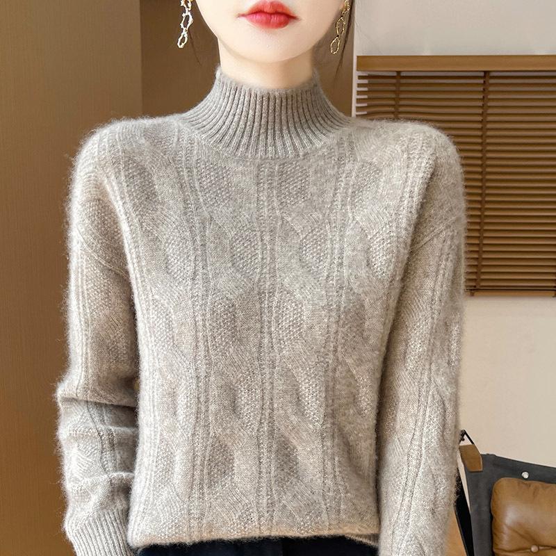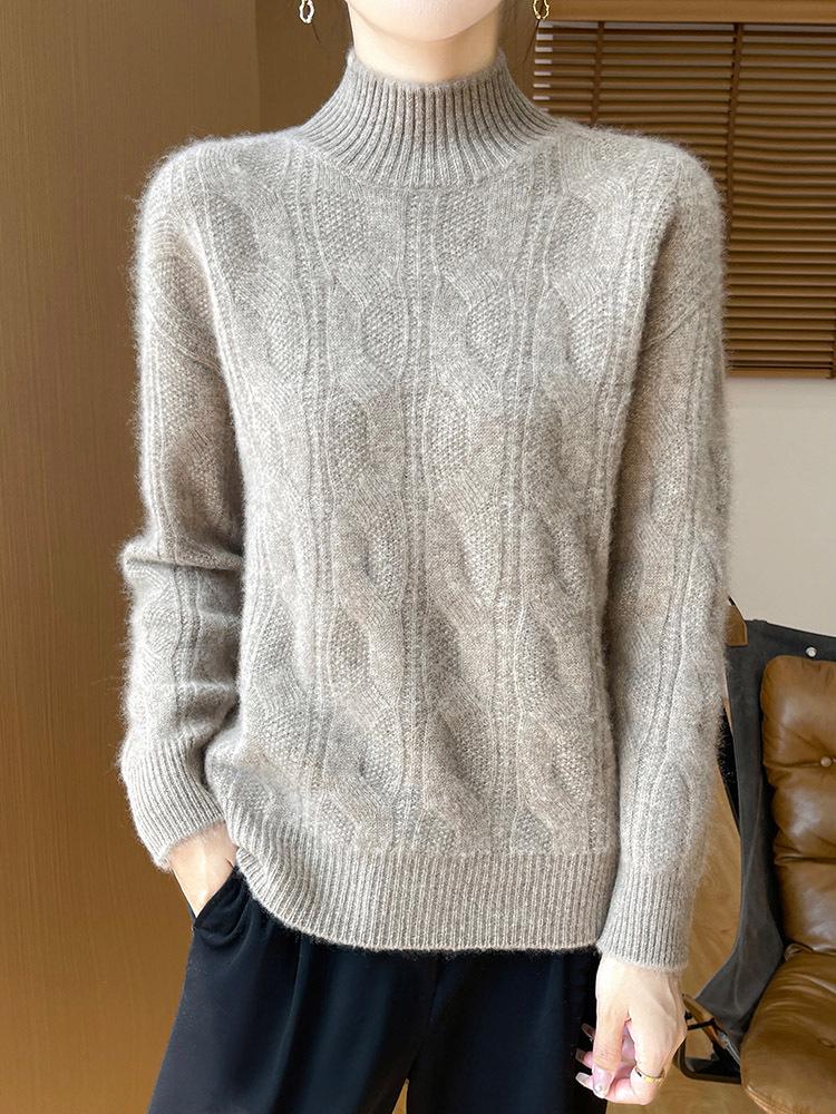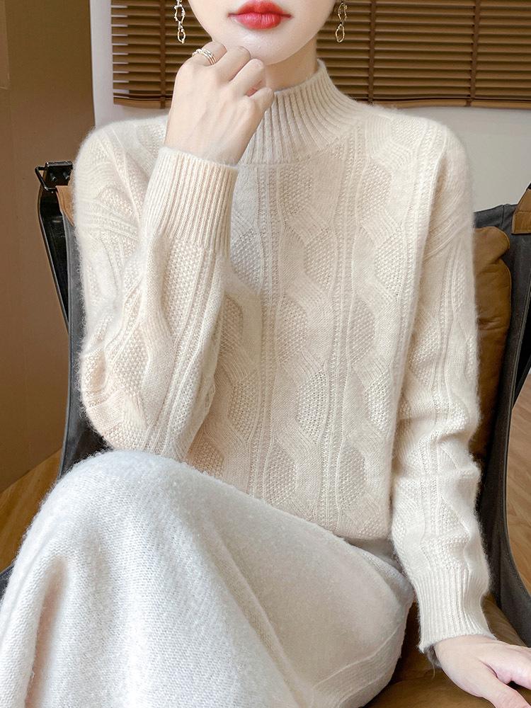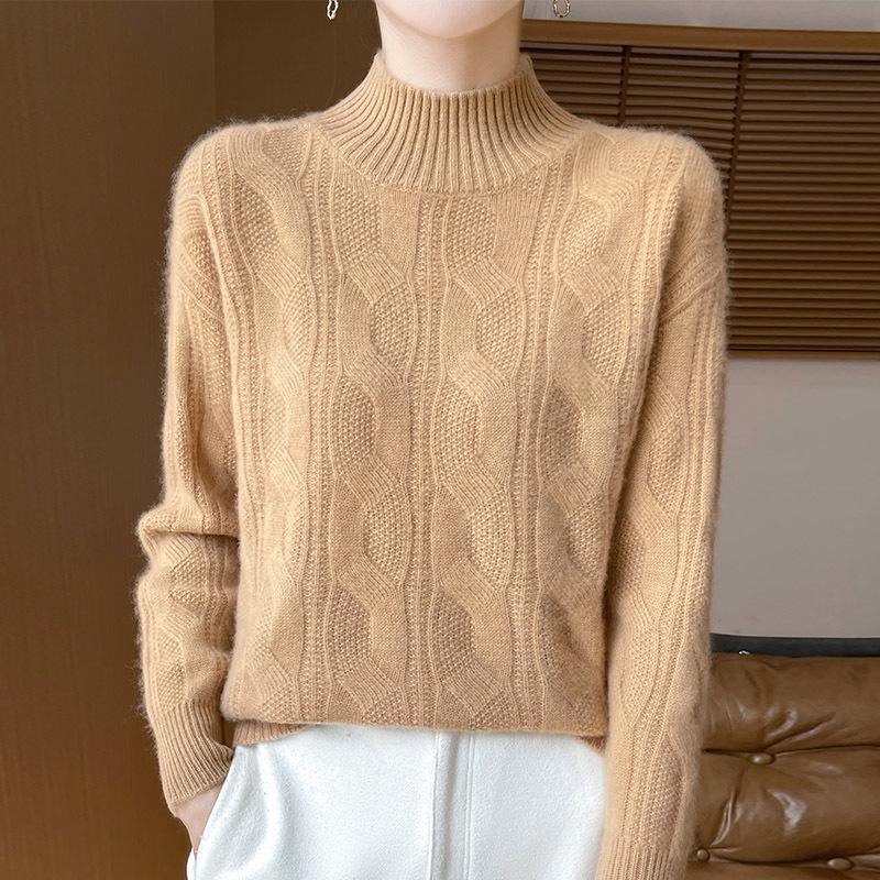 2025 Осень/Зима Приталенный Винтажный Кашемировый Свитер Крупной Вязки с Полувысоким Воротником