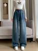 Джинсовые брюки больших размеров с высокой посадкой и широкими штанинами для женщин - Длина до пола, Свободный крой, Стройнящие, Осенний стиль, Подходят до 200 цзинь