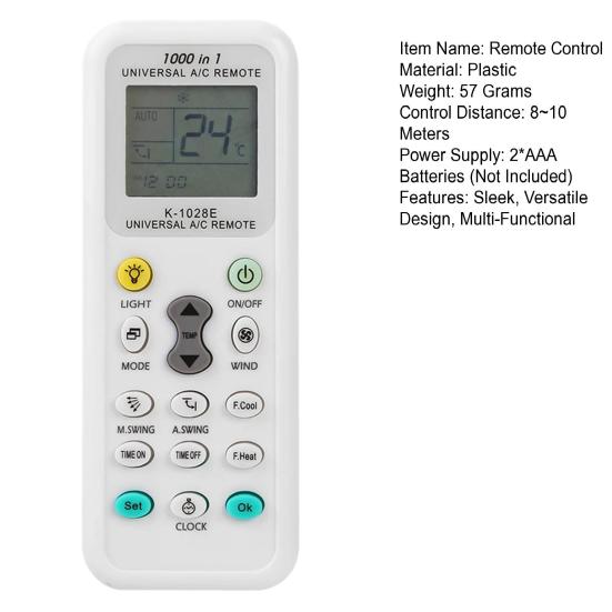 Улучшите ваш опыт кондиционирования воздуха с этим стильным и элегантным универсальным пультом дистанционного управления. С дальностью 8-10 метров вы можете легко регулировать настройки из другого конца комнаты. Большой ЖК-экран делает настройку и эксплуатацию очень простыми, а встроенные часы, таймер включения/выключения и функция ночника добавляют удобства в вашу повседневную рутину..