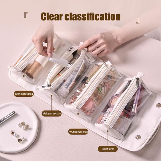 Инновационный складной дизайн 4-в-1: Оцените непревзойденную универсальность этой сумки, которая уникальным образом складывается и раскладывается на четыре отдельных отделения, предлагая гибкое решение для хранения всех ваших косметических принадлежностей компактным и эффективным способом.