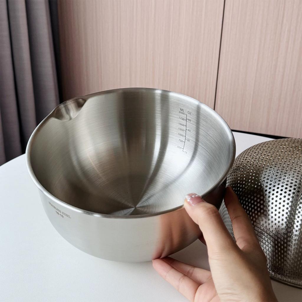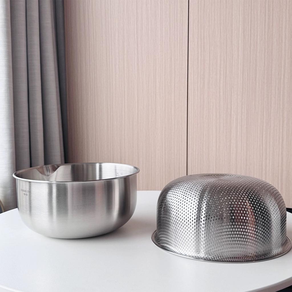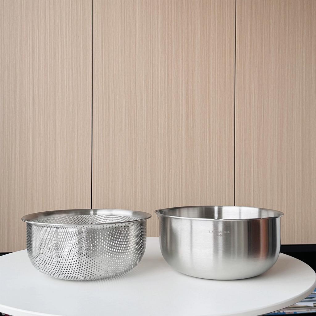 Изготовленный из высококачественной нержавеющей стали 304, этот набор из дуршлага и миски прочный, устойчивый к ржавчине и безопасный для ежедневного контакта с пищей.. Его двухслойная конструкция включает внутренний дуршлаг с мелкими отверстиями и глубокую внешнюю миску, что делает его идеальным для мытья овощей, промывания риса, слива макарон или чистки фруктов – действительно многофункциональный.