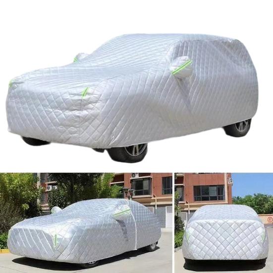 Полная защита: Защитите свой автомобиль от града, дождя, снега и УФ-лучей с помощью нашего премиального чехла для автомобиля против града.. Благодаря утолщенной конструкции, серебристому светоотражающему внешнему слою и мягкому хлопковому внутреннему слою, он эффективно отталкивает снег, лед, иней и пыль.