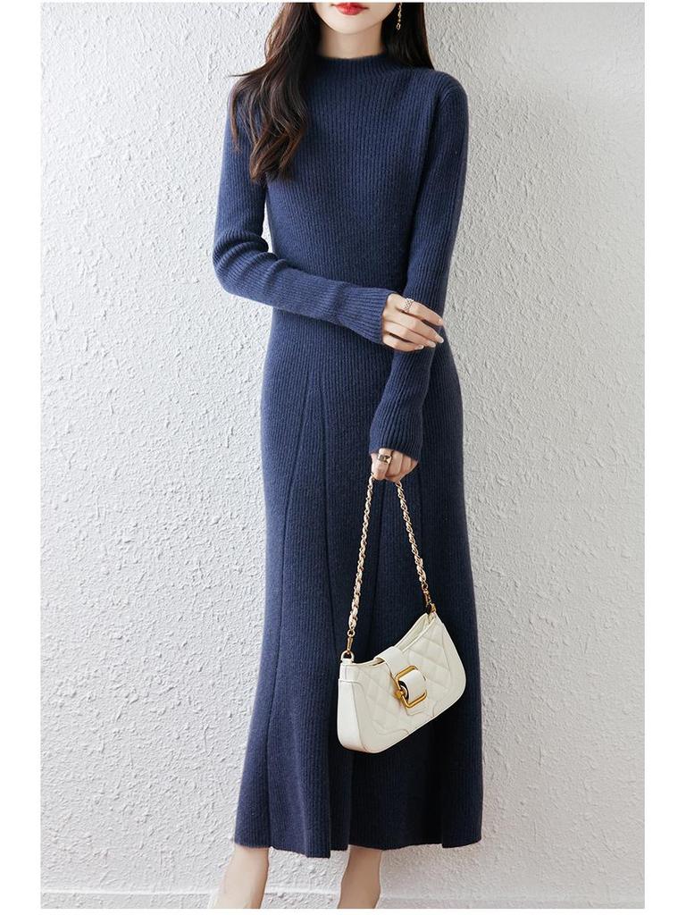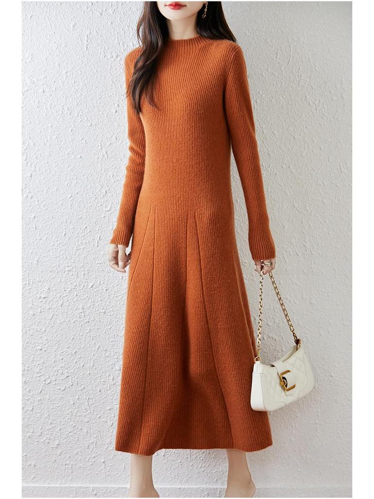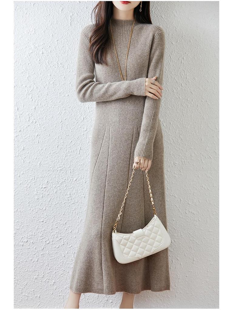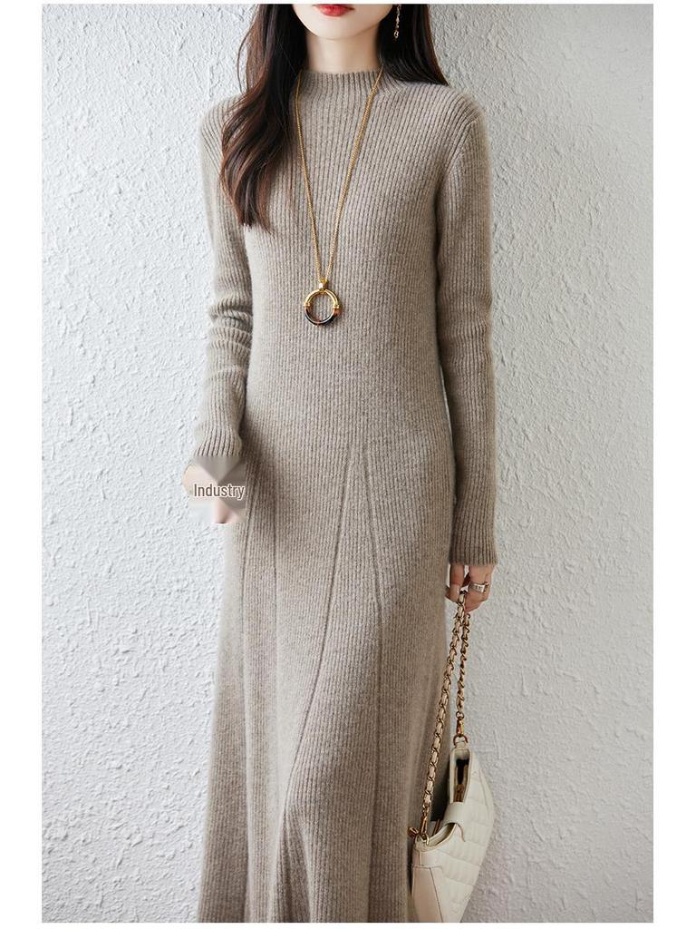 2025 Осень/Зима Женское Облегающее Вязаное Шерстяное Платье А-силуэта Миди с Полувысоким Воротником