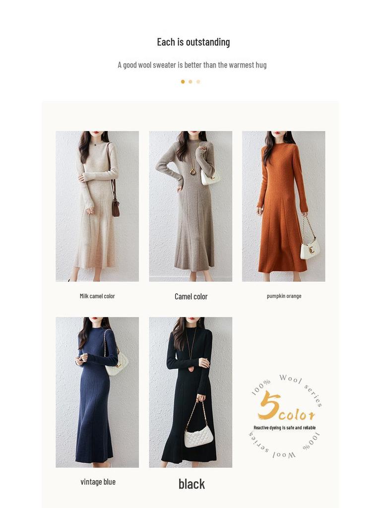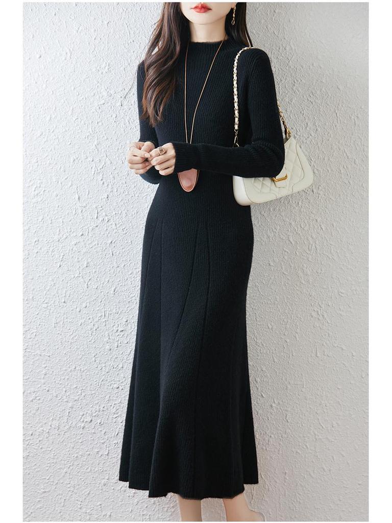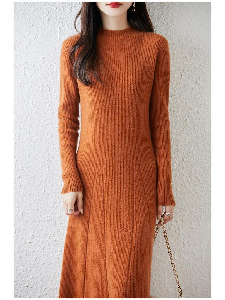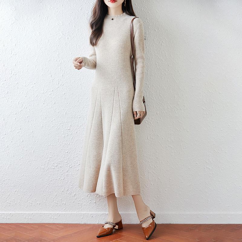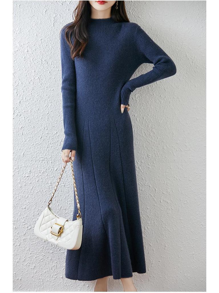 2025 Осень/Зима Женское Облегающее Вязаное Шерстяное Платье А-силуэта Миди с Полувысоким Воротником