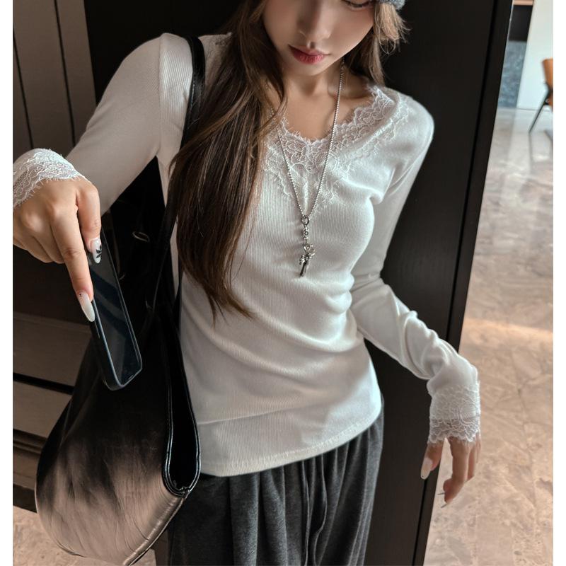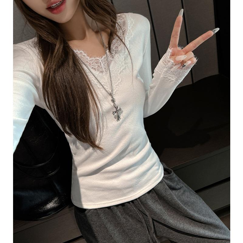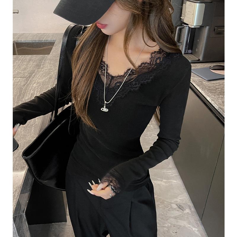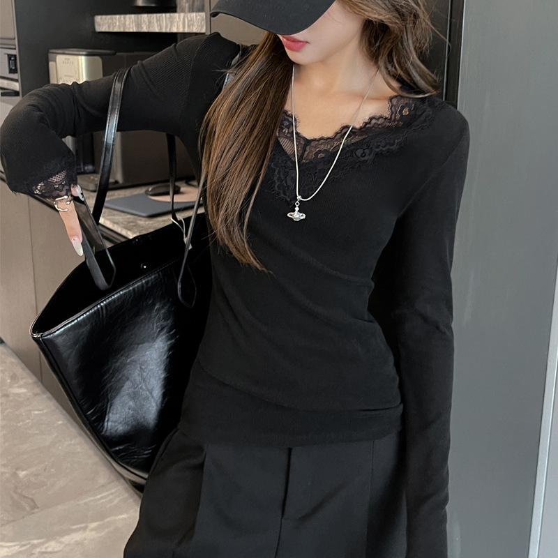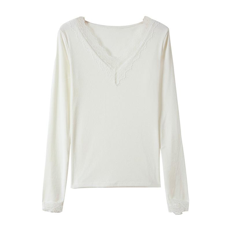 Весна Осень V-образный вырез Кружевная вставка Однотонная футболка с низом Женская с длинным рукавом Приталенная Универсальная Повседневная футболка Пуловер Топ