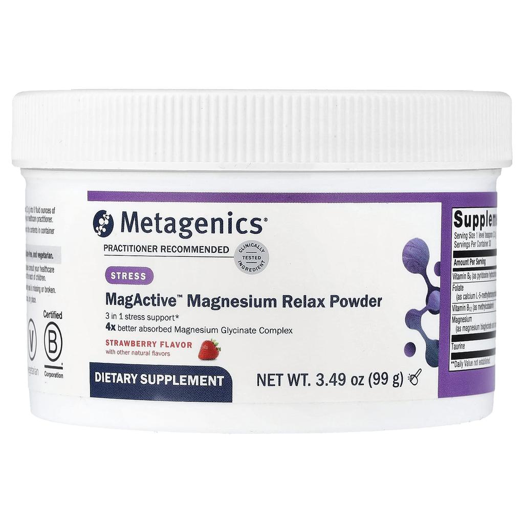 Product Description: Recommended by Healthcare Professionals. Clinically Tested Ingredients. Steam 3-in-1 Stress Support. Contains Other Natural Flavors. Supplements. Non-GMO, Gluten-Free, and Suitable for Vegetarians. Certified by B Corp. MagActive™ Magnesium Relax Powder is a high-potency formula scientifically designed to support positive mood, relaxation, and a healthy stress response. †MagActive boasts up to 4x better absorption than magnesium glycinate complex. †Helps relieve irritability, muscle tension, and stiffness—three common symptoms of stress. †Two servings per day only. If dietary intake is inadequate. Up to 4x better absorption than conventional forms of magnesium, as estimated by SHIM data. Individual experiences may vary.