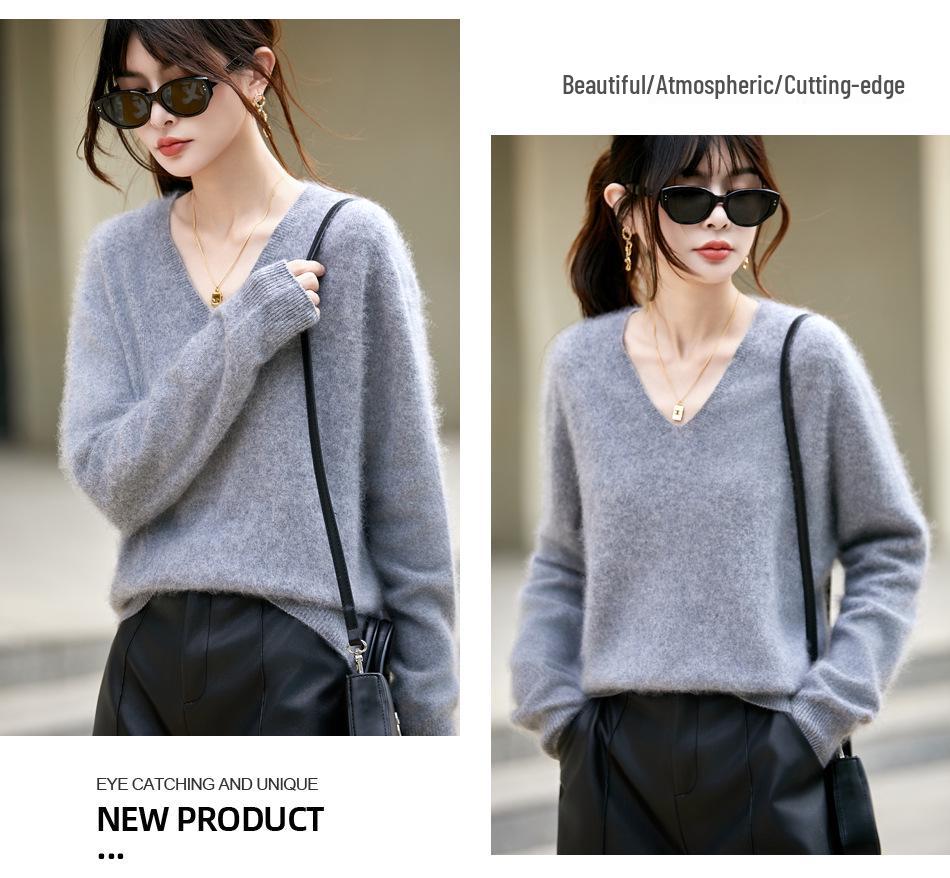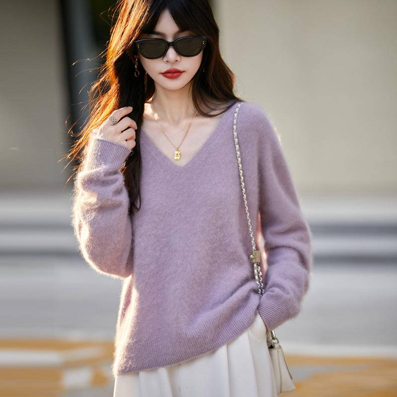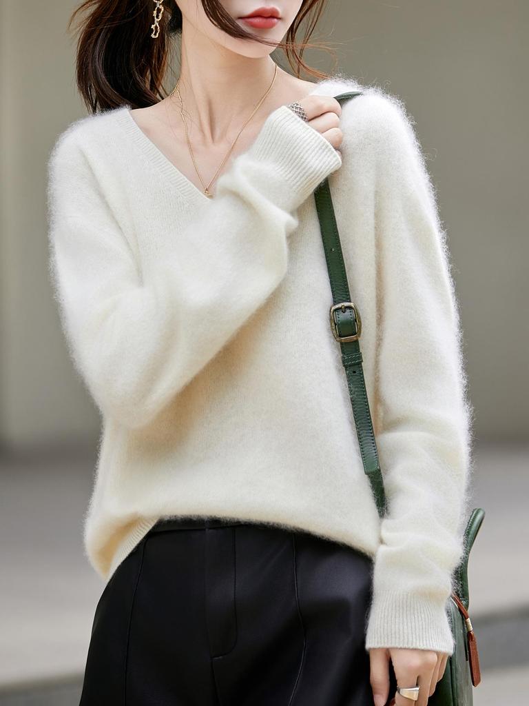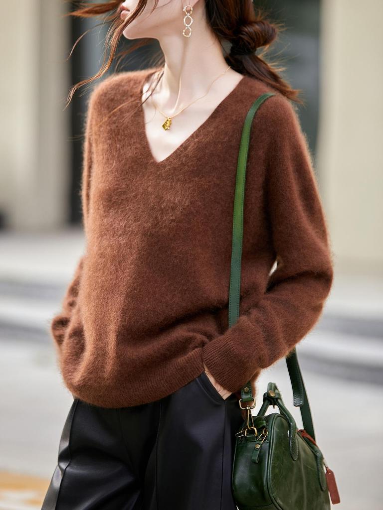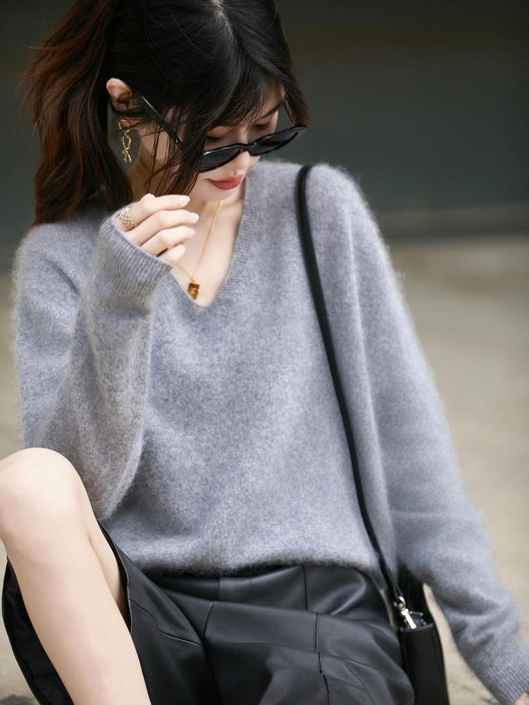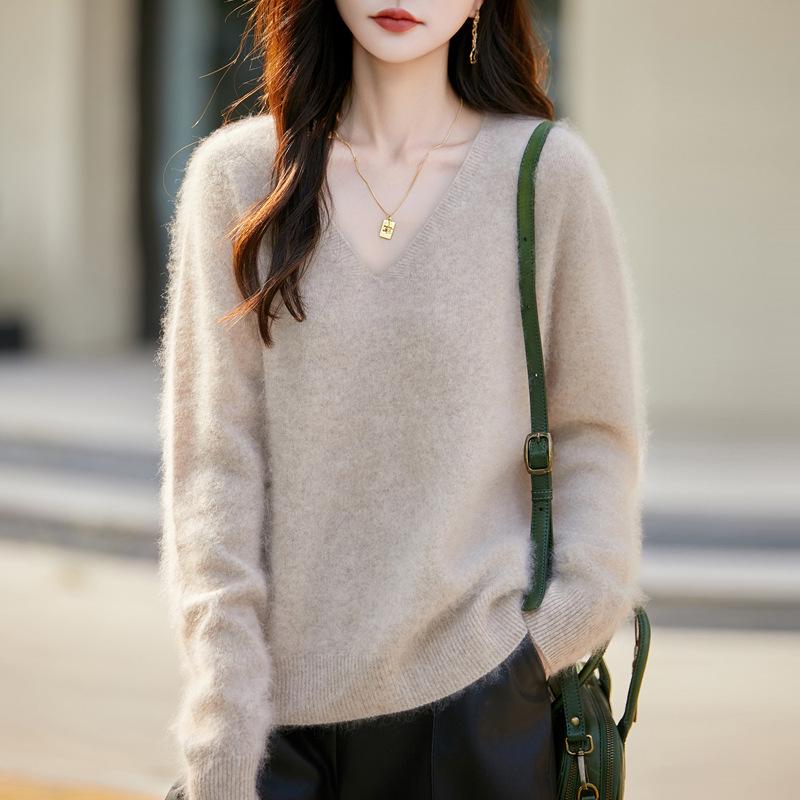 Женский осенне-зимний свитер с V-образным вырезом из бесшовной матовой шерсти - вязаный пуловер свободного кроя
