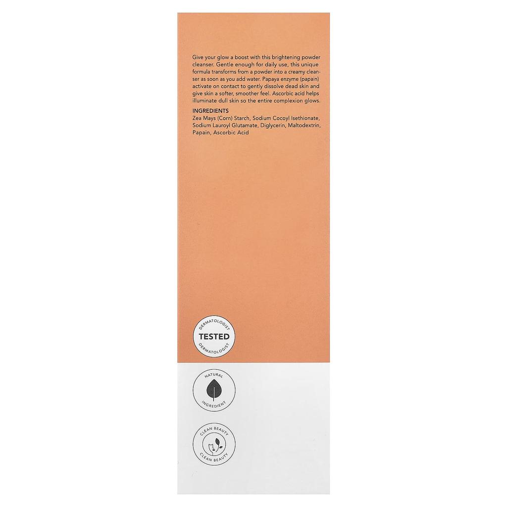 Product Description: 3 in 1 - Exfoliating, Refreshing, and Radiance-boosting. Vitamin C + Enzymes. Fruit Enzymes to Smooth and Revitalize Skin. Powder to Foam. Dermatologist-Tested. Natural Ingredients. Clean Beauty. This gentle daily cleanser helps exfoliate and enhance skin's radiance with the power of papain. Unleash your radiance with this brightening powder cleanser. This unique formula is gentle enough for daily use and transforms from powder to creamy when mixed with water. Papaya enzymes (papain) activate upon contact with skin, gently dissolving dead skin cells and leaving skin soft and smooth. Ascorbic acid brightens dull skin, revealing an all-over glow.