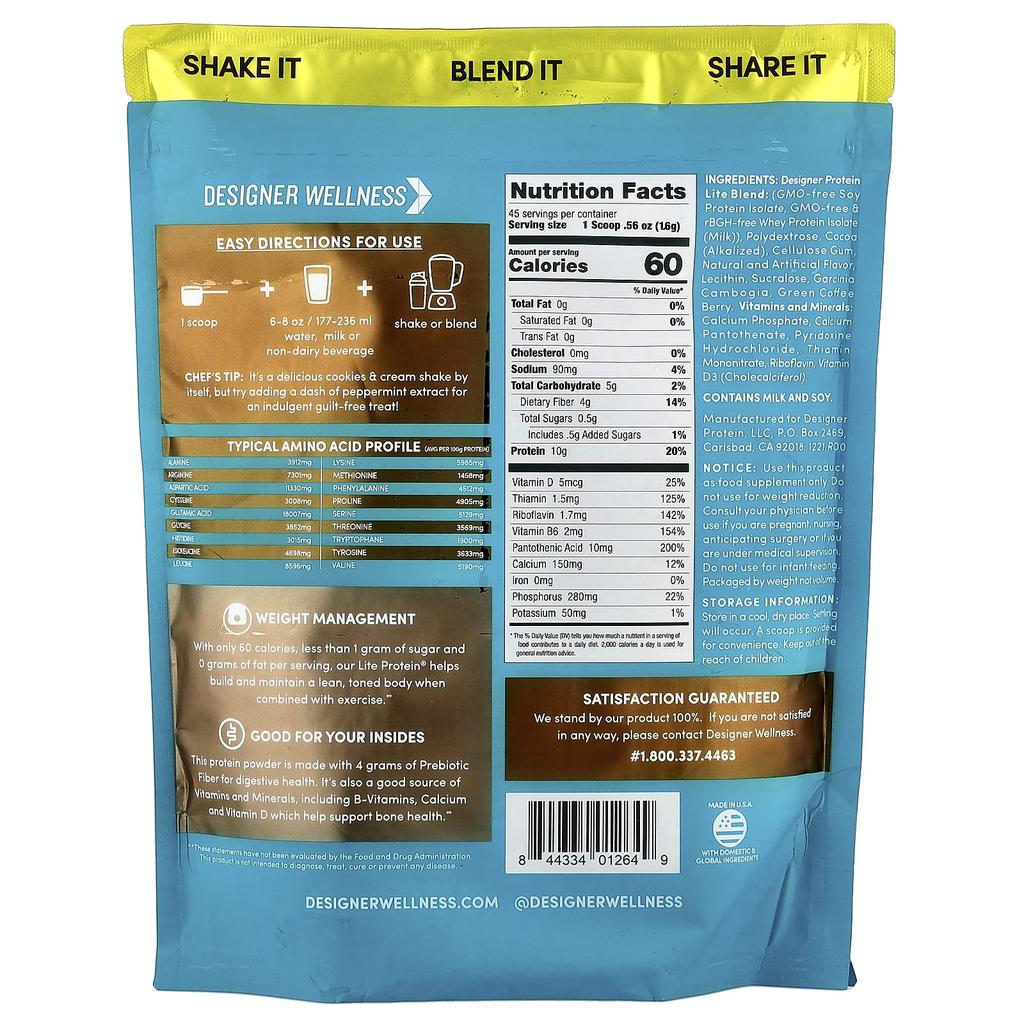 Product Description: Shake - Mix - Share1g Net CarbsNatural and Artificial FlavorsVegetable + Whey Protein Powder, Green Coffee Berry and Garcinia Cambogia10g Protein†<1g Sugar†60 Calories†Kosher CertifiedGluten FreeNon-RGBH and Non-GMO Whey Rich in B VitaminsContains Essential BCAAs and EAAsWeight ManagementWith 60 calories, less than 1g sugar and 0g fat per serving, Lite Protein® helps build and maintain a lean physique when combined with exercise. Good for YouThis protein powder is formulated with 4g of prebiotic fiber for digestive health. It's also a great source of vitamins and minerals, including B vitamins, calcium, and vitamin D, which promote bone health.† Per serving