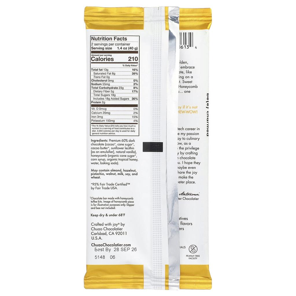 Product Description: Signature Collection Gourmet Chocolate Experience Chef: Michael Antonorsi, 2002 PST, Contains Joy®, Kosher Dairy, Non-GMO Project Certified, Fair Trade Certified™ Ingredients, Amazing Experience, Gluten-Free, Manufactured in a peanut-free facility, Sweet, organic caramelized honey coated in dark chocolate. Experience: Crunchy pieces of golden caramelized honey envelop the dipped dark chocolate, reminiscent of secret lovers on a warm summer night. Each bite of this sweet and elegant Honeycomb bar is a treat. At CHUAO, we guarantee you won't be chew-wowed by its exceptional taste! Free of: Artificial Preservatives, Artificial Colors and Flavors, Artificial Sweeteners, Trans Fats, Chocolate Bar Made with Honeycomb Toffee Powder. Honeycomb piece image is for illustrative purposes only. Dippers and bees are not included.