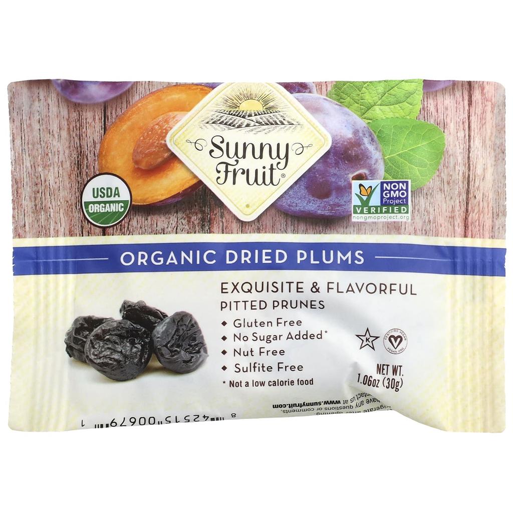 Product Description: USDA Organic Certified, Non-GMO Project Verified, Flavorful and Delicate, Pitless Plums, Gluten Free, Nut Free, Sugar Free, Sulfite Free, Convenient and Clean, Kosher Certified, Vegan Certified, EcoCert Organic Certified, The Only "Delicious and Delicious" Plum Founded in 1993, the Sunny Fruit® difference begins at the source. Our fertile soil and unique climate create the planet's most perfect organic pitless plums. After harvest, we meticulously sun-dry them for ideal sweetness. Each plum is packaged in a way that truly captures the "beautiful and flavorful" quality. With no artificial ingredients added, our packaging is artificial, ensuring complete quality control and freshness. You'll taste the difference! The Perfect Plums for Everyday Life: Organic pitless plums are a wonderful way to add healthy, nutritious, and delicious sweetness. Enjoy them anytime, anywhere with our convenient daily packs! They're also a great way to enjoy a fresh, delicious snack any time of day, perfect for any lifestyle, making them incredibly convenient for on-the-go consumption. Sunny Fruit® Organic Plums in Portion Packs are perfect for an afternoon snack at the office, a snack for your kids' school lunches, or a light breakfast for busy mornings. Sunny Fruit® Organic Plums: Serve as a healthy snack, a breakfast snack, a lunchbox for your kids, an addition to any dinner recipe, a dessert with granola and yogurt, and more. *Not a low-calorie food.