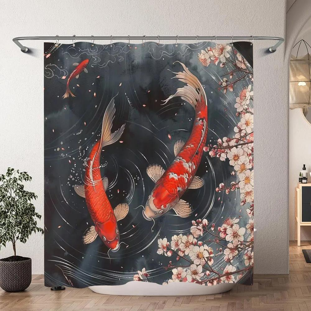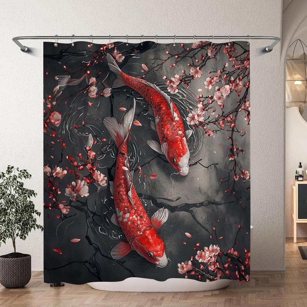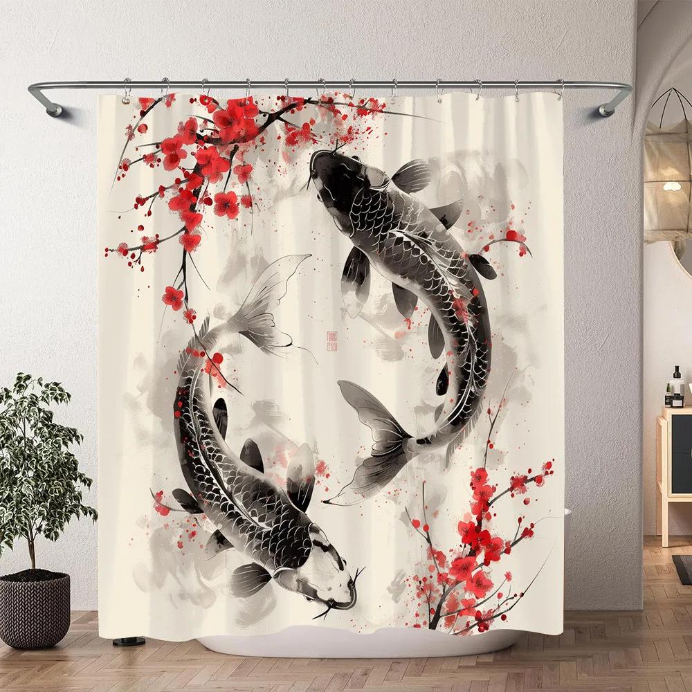 Chinese Japanese Koi Ink Painting Shower Curtain Red Cherry Blossom Wave Fish Watercolour Painting Bath Curtains Bathroom Decor