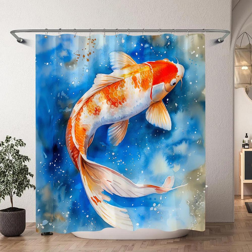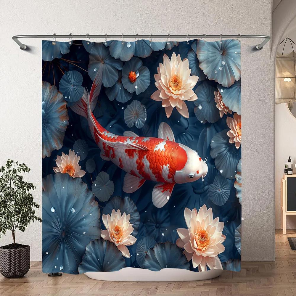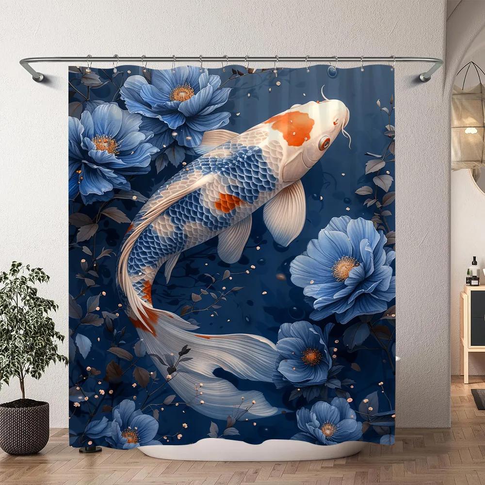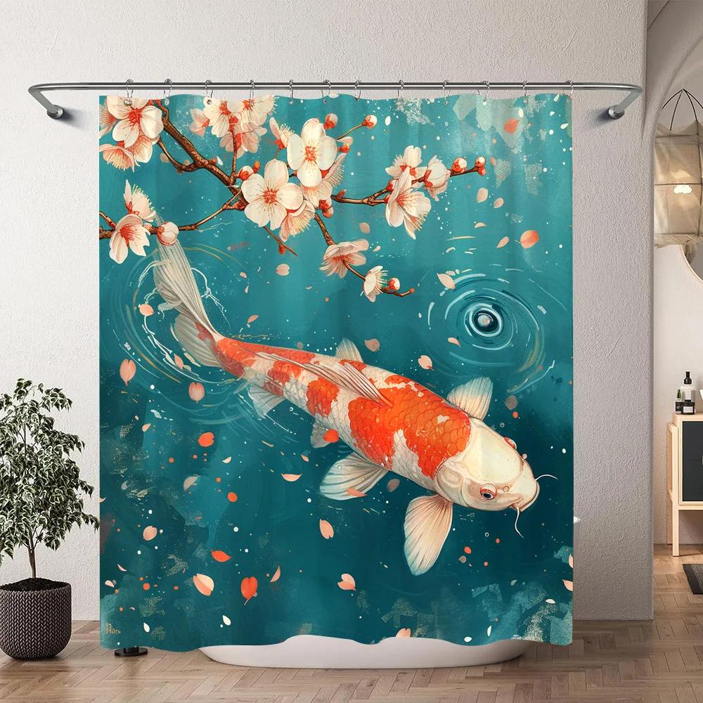 Chinese Japanese Koi Ink Painting Shower Curtain Red Cherry Blossom Wave Fish Watercolour Painting Bath Curtains Bathroom Decor