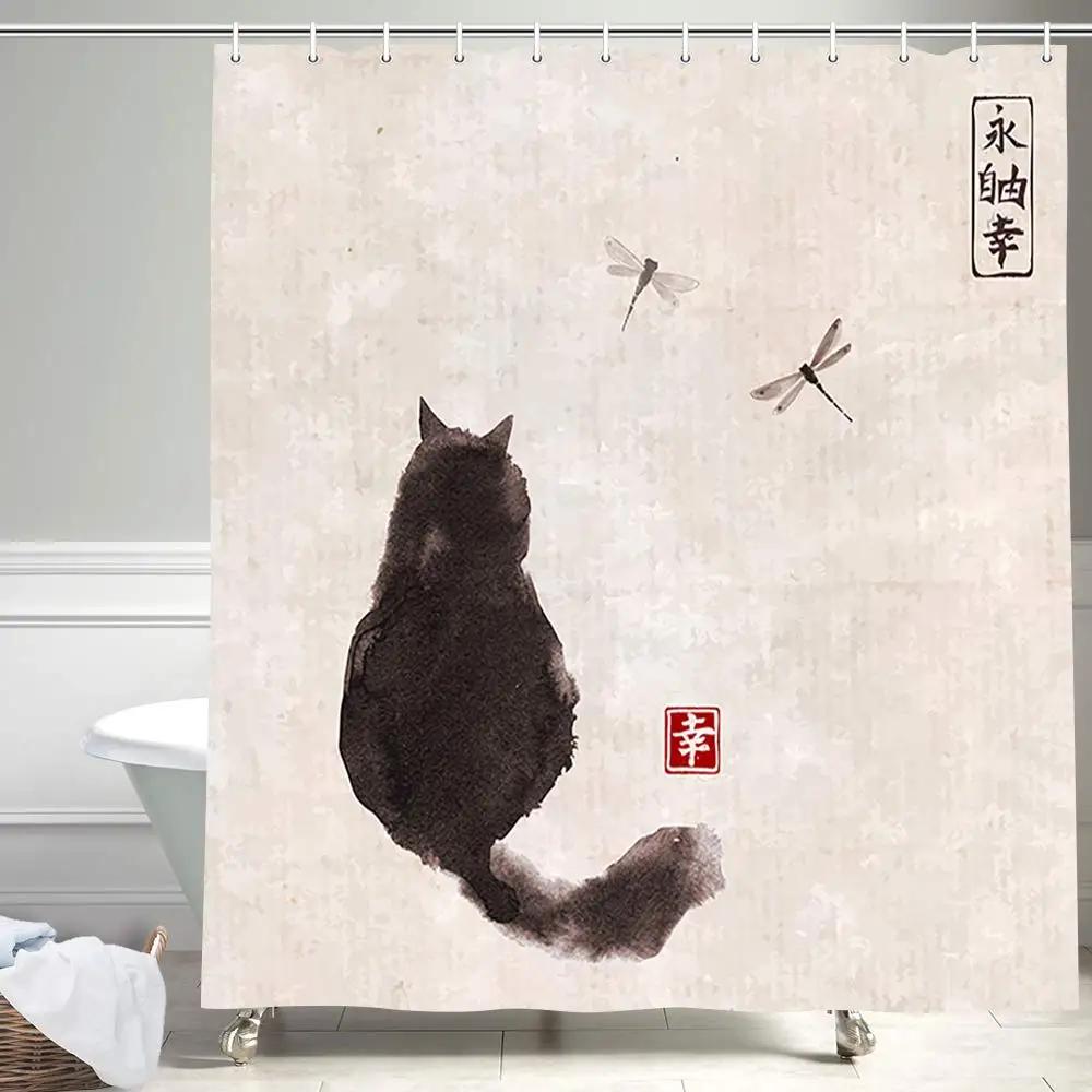 Занавеска для ванной Zen Cat and Dragonfly - Высококачественный водонепроницаемый и устойчивый к плесени декор для ванной комнаты для спокойного дома в восточном стиле