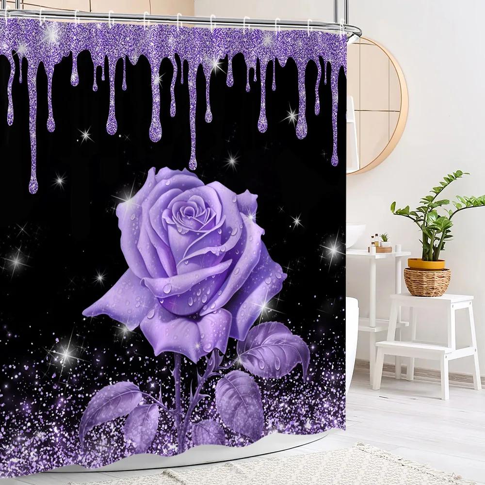 Розовая блестящая роза Занавеска для душа и коврик Набор для ванной комнаты Цветочные розовые блестящие занавески для душа Коврик для ванной комнаты Декор для ванной комнаты с крючками
