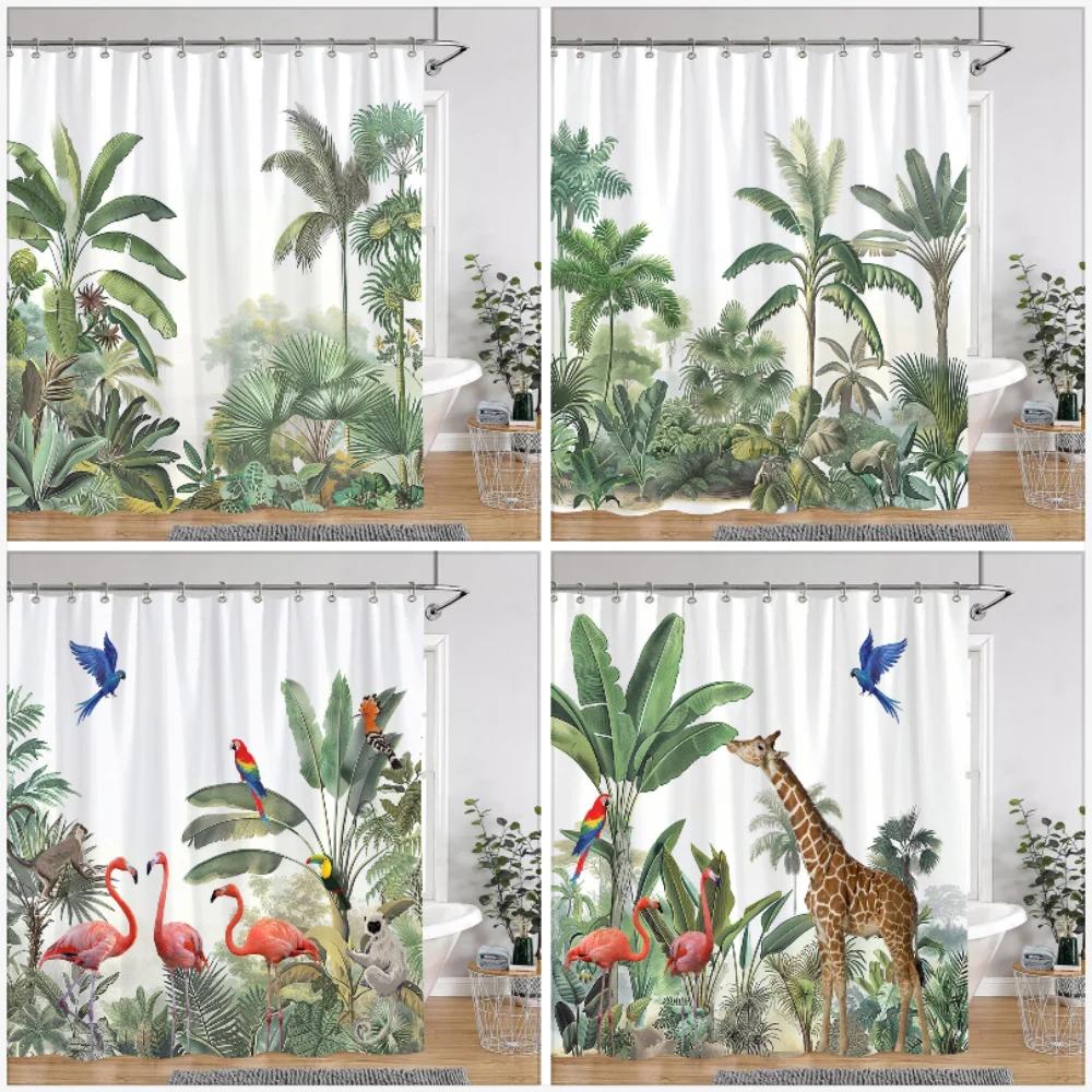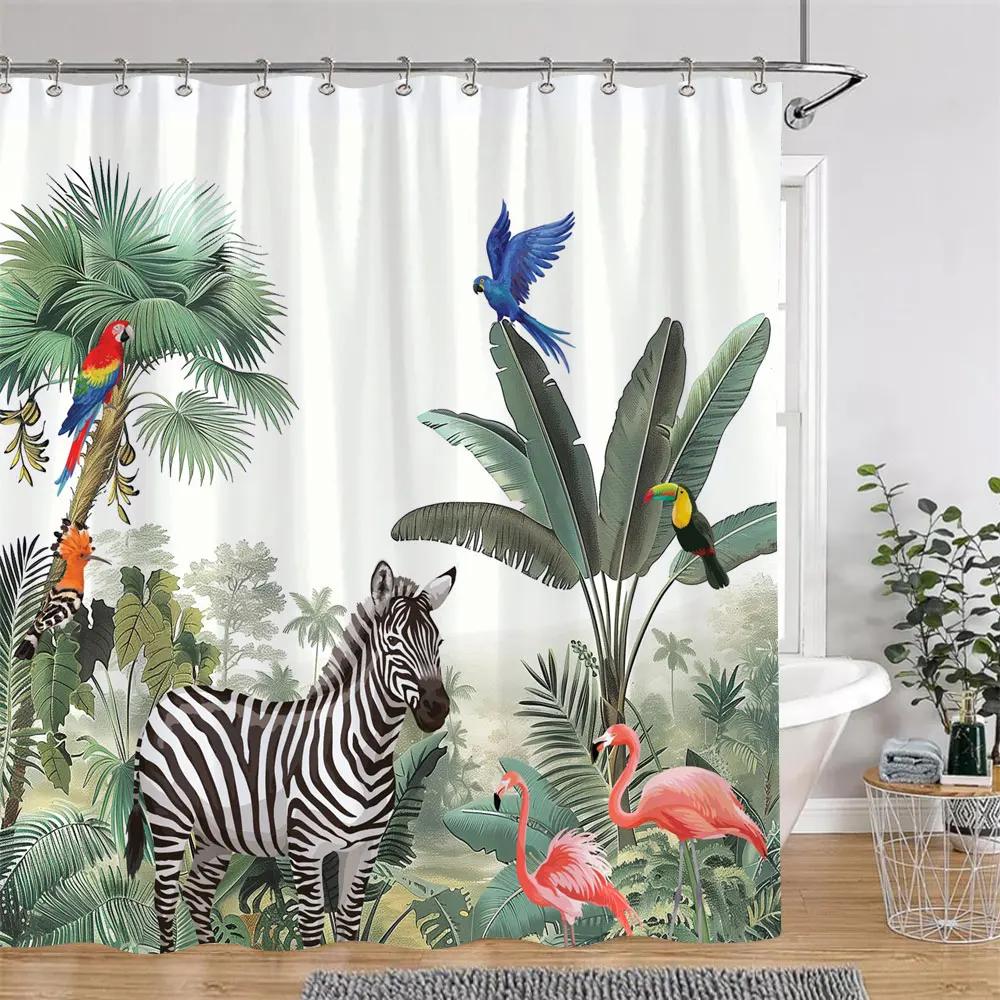 Tropical Botanical Jungle Animal Shower Curtain Coconut Flamingo Giraffe Bluebird Polyester Fabric Shower Curtain Bathroom Decor