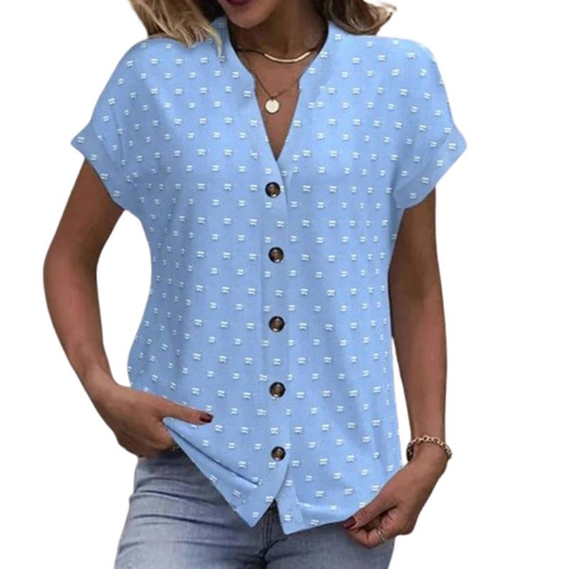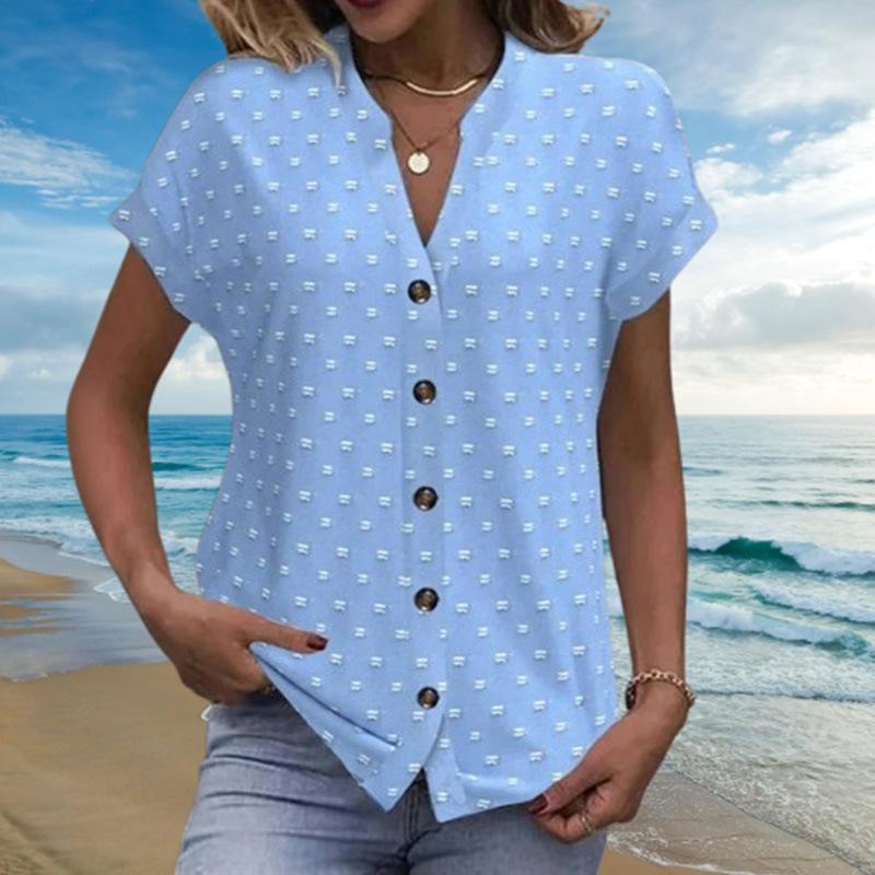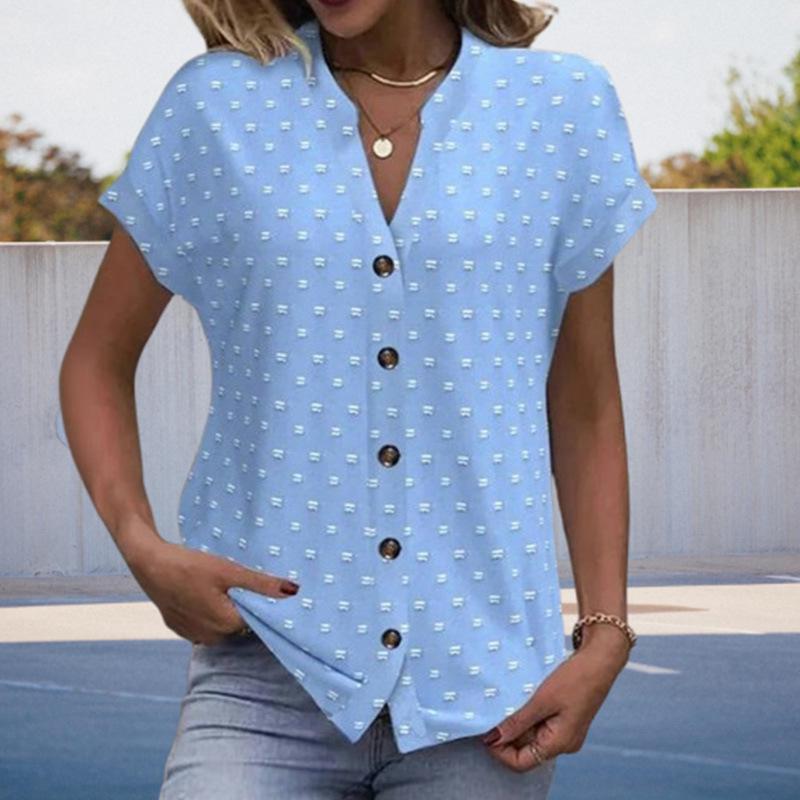 Освежите свой летний гардероб этим светло-голубым топом с игривым гороховым принтом. Этот топ, изготовленный из смеси хлопка и полиэстера, дарит мягкое и комфортное ощущение, идеально подходящее для повседневных выходов.. Рукав реглан и короткие рукава обеспечивают расслабленную посадку, а воротник-стойка добавляет нотку изысканности вашему ансамблю.. Этот топ, будь то в сочетании с джинсами или юбкой, является универсальным дополнением к любой летней коллекции стиля.