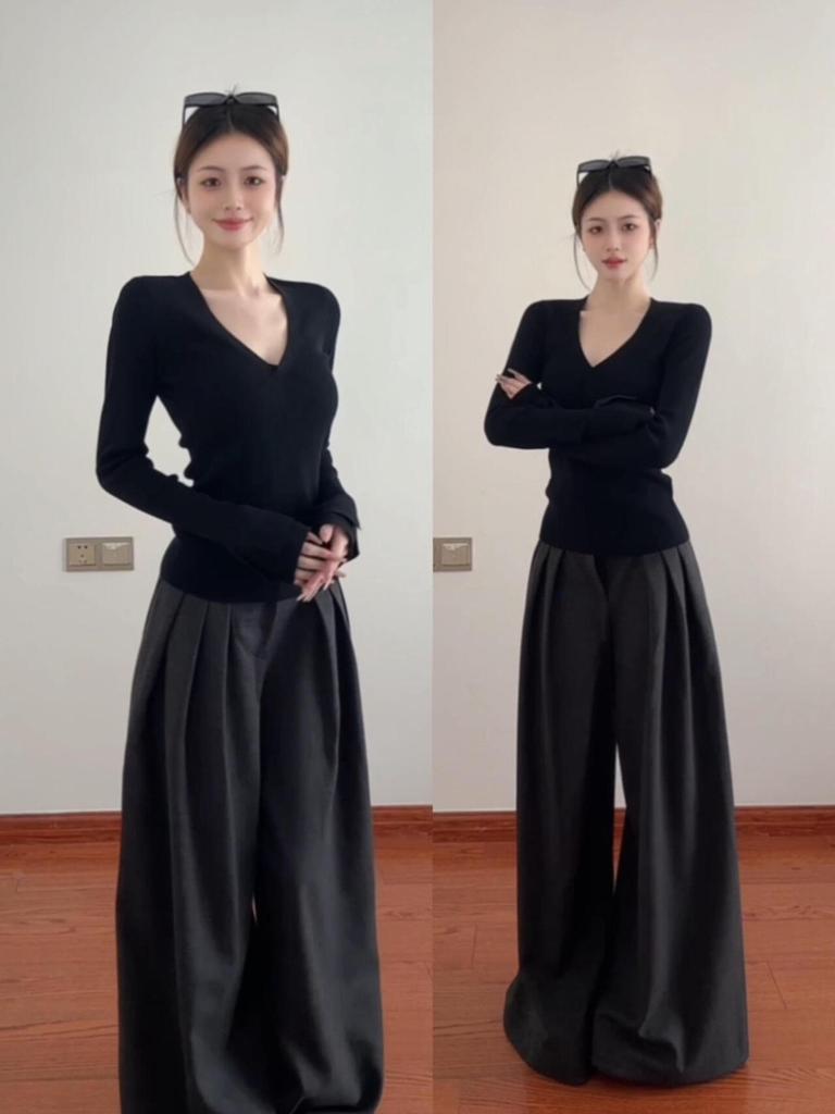 Women's Black V-Neck Slim Fit Long-Sleeve T-Shirt - Cinched Waist Korean Style for Early Autumn and Winter.