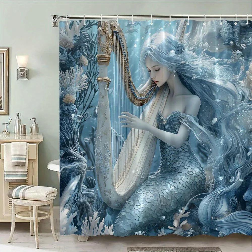 Очаровательная занавеска для душа «Арфа русалки» - Океанический фэнтези-дизайн для современного декора ванной комнаты, водонепроницаемая, простая в уходе и уникальное искусство