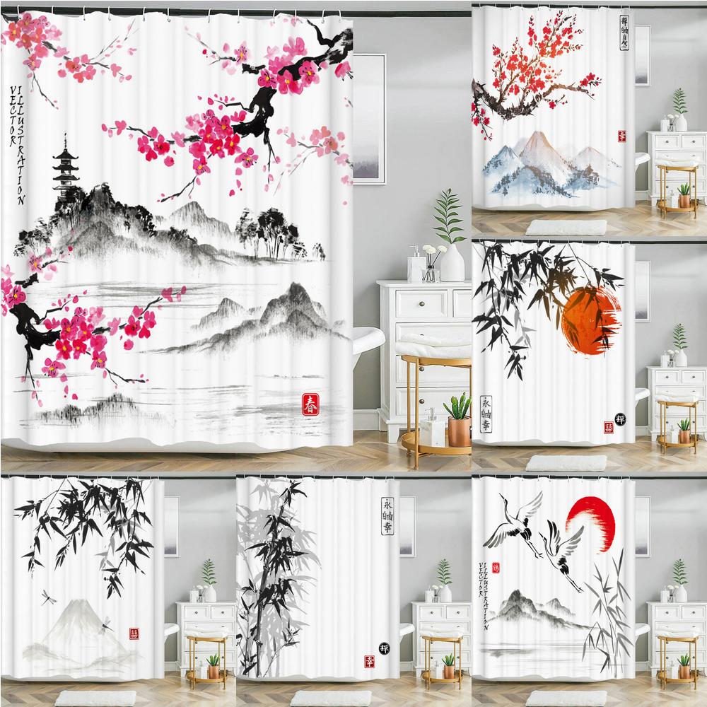 Цветы в японском стиле Слива Шторки для душа Занавеска для ванной Тканевая Водонепроницаемая Полиэстеровая Занавеска для ванной с крючками
