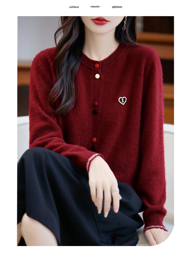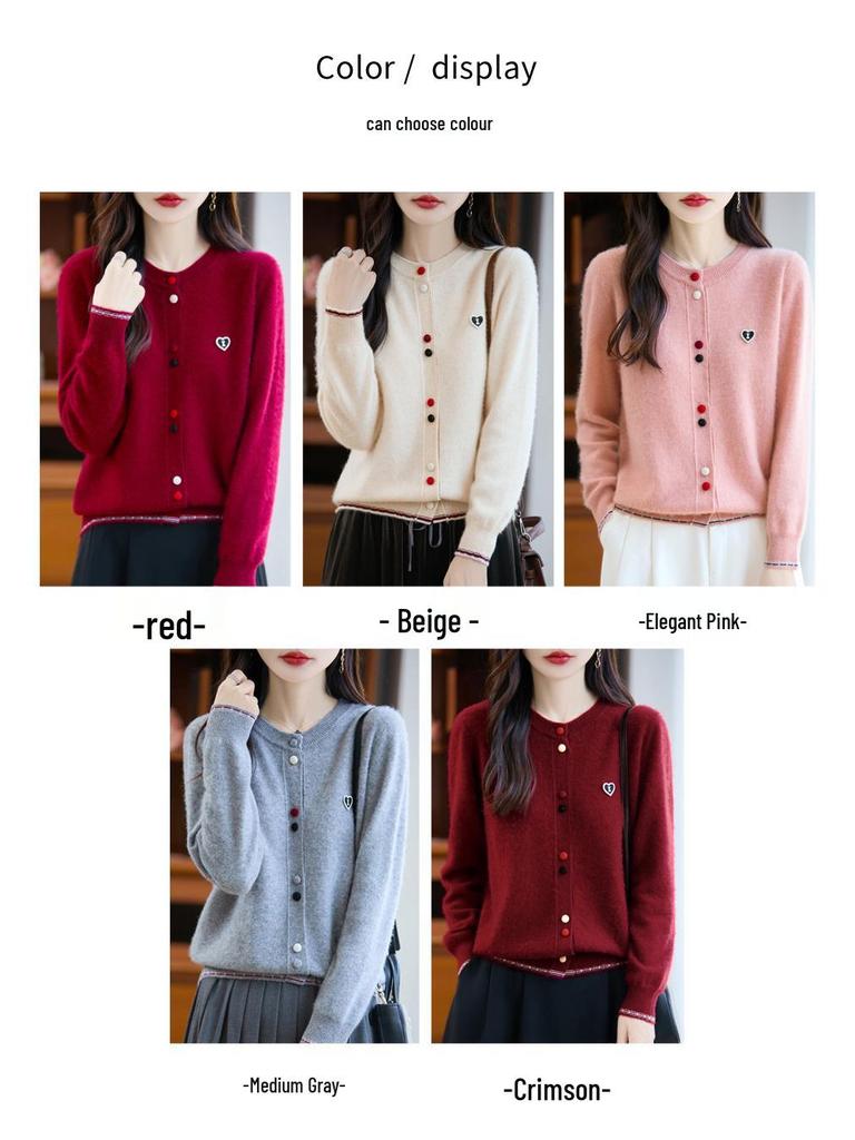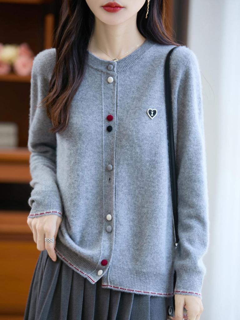 Дизайнерский шерстяной кардиган в стиле колор-блок - Пряжка в виде сердца, Круглый вырез, Универсальный повседневный свитер для осени/зимы