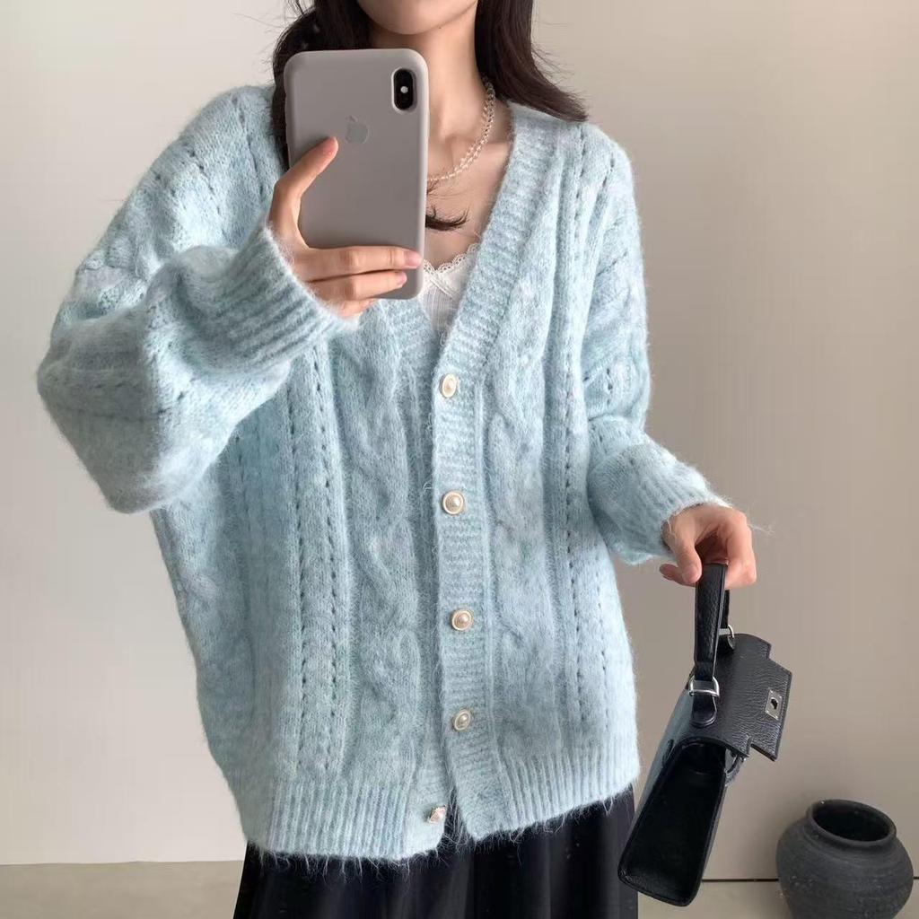 Женский корейский кардиган крупной вязки с V-образным вырезом - Свитер-пальто в повседневном стиле для осени и зимы — купить товар онлайн с бесплатной доставкой по всему миру!