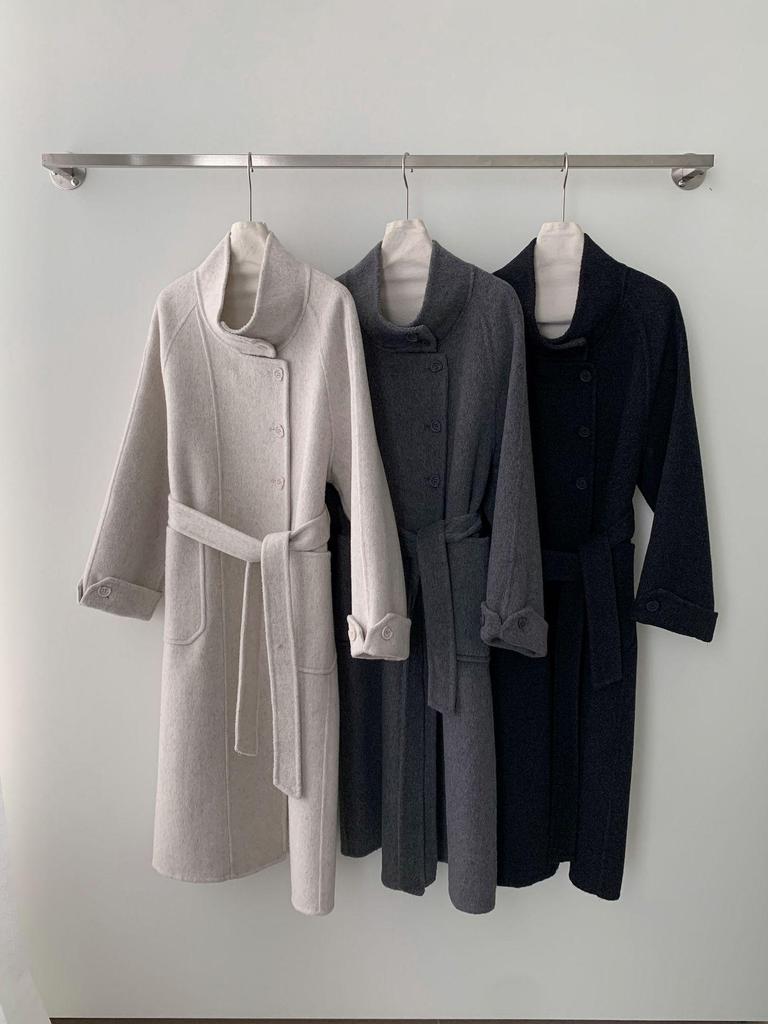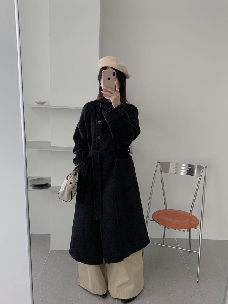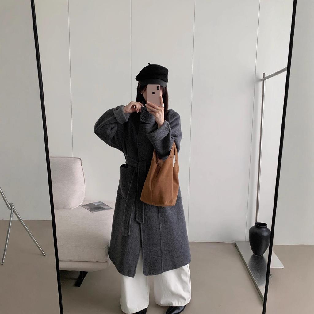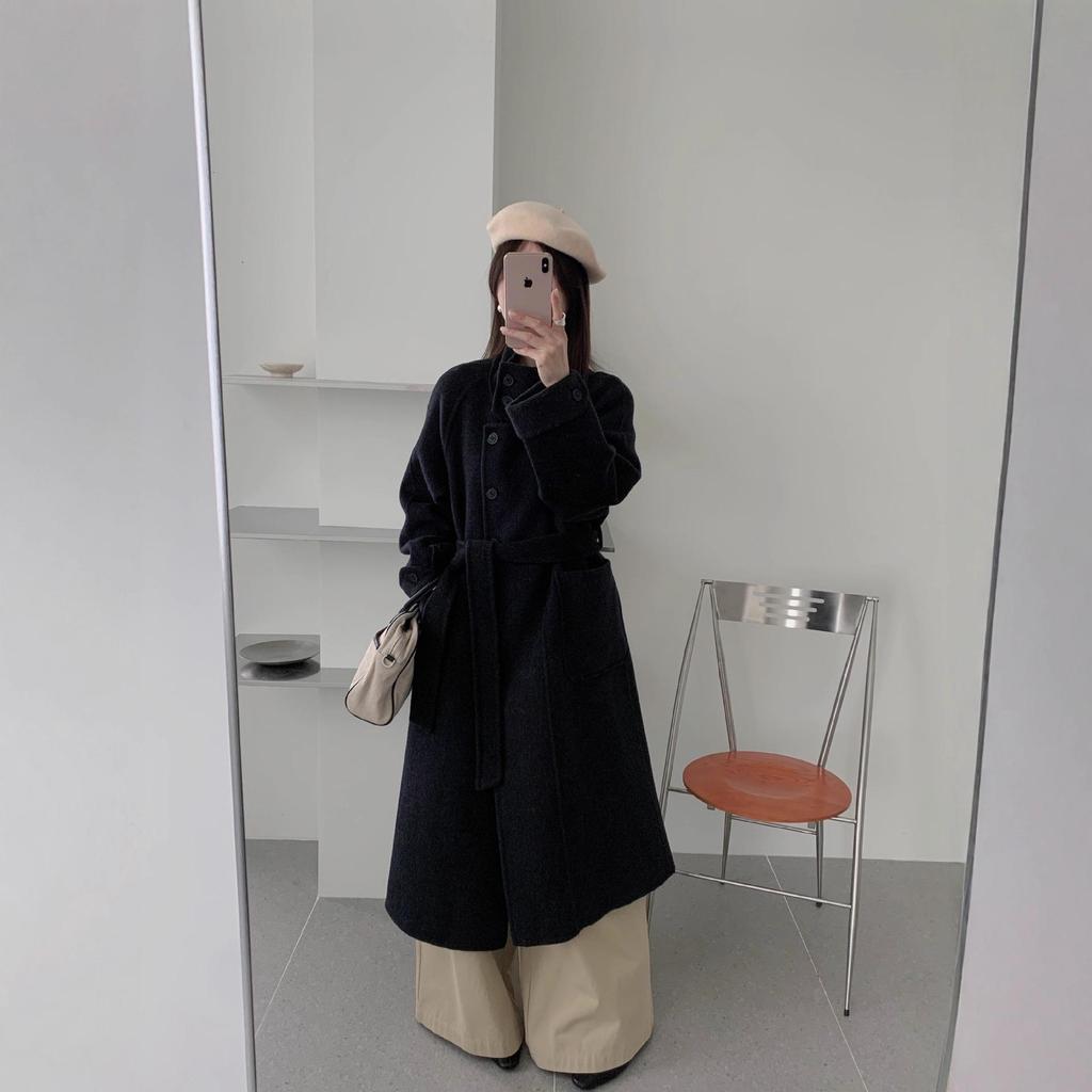 Пальто из двухсторонней шерсти в корейском стиле со стойкой, поясом и удлиненным дизайном для осени/зимы 2025