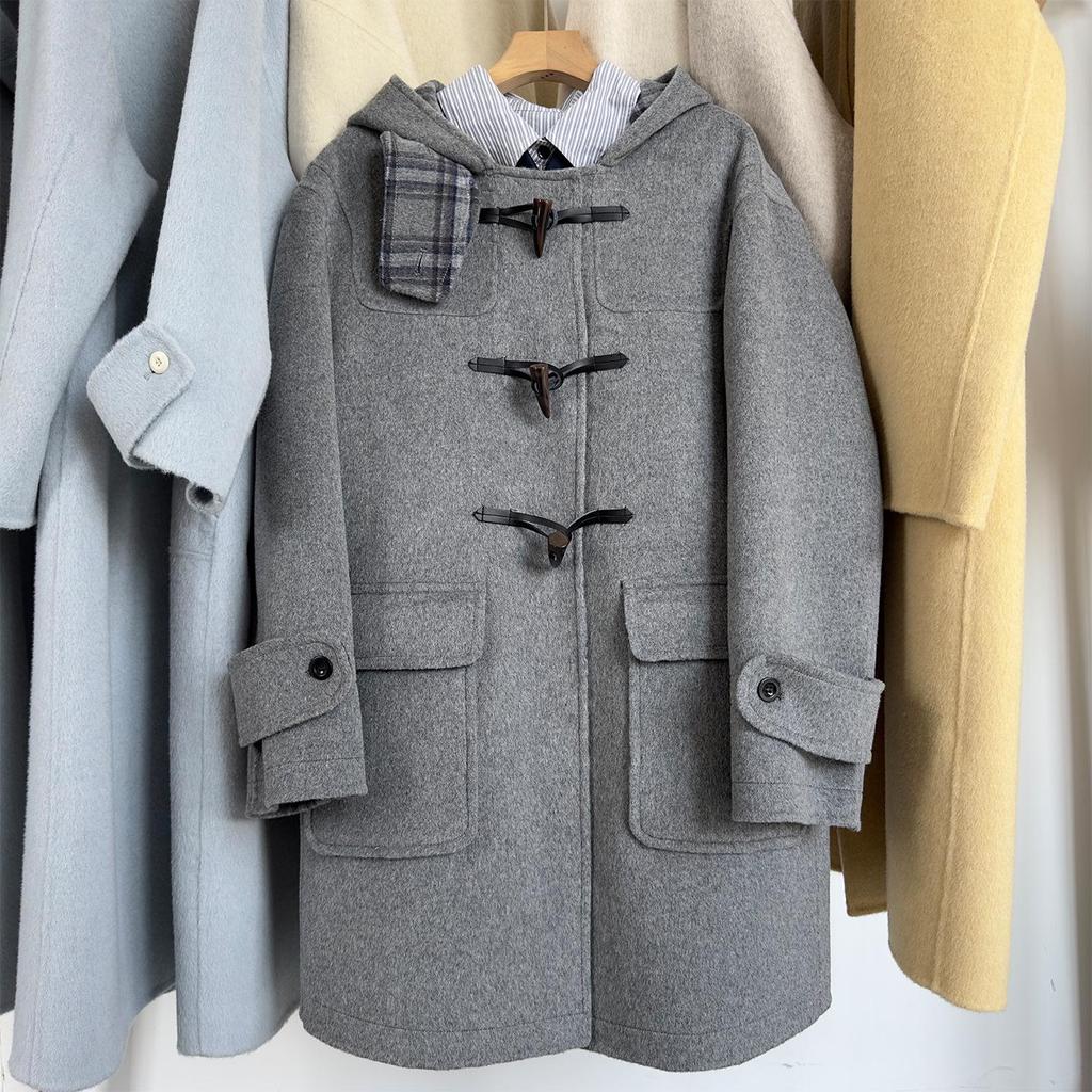 Женское пальто средней длины из шерстяной смеси в стиле преппи от E-Family с капюшоном и застежкой-пуговицей.