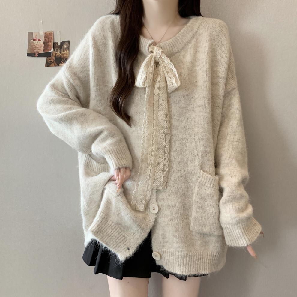 Удлиненный милый кардиган французской вязки - Осень/Зима 2025 Свитер с бантом