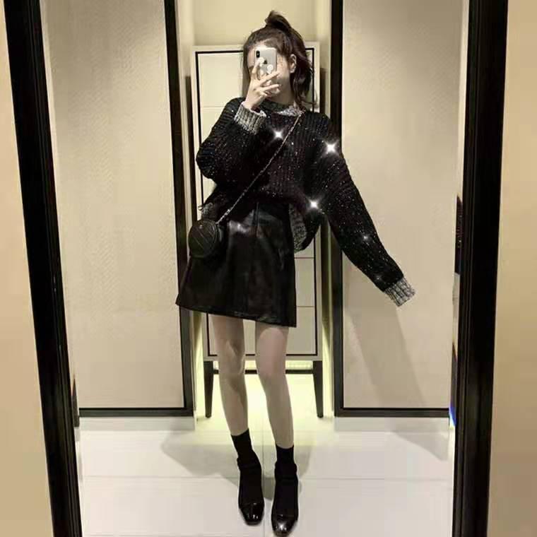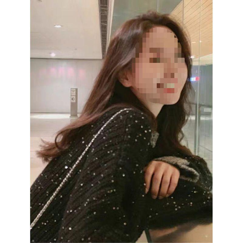 Женский вязаный свитер свободного кроя в стиле Гонконга с черными пайетками на осень/зиму 2025 года - Универсальный расслабленный крой