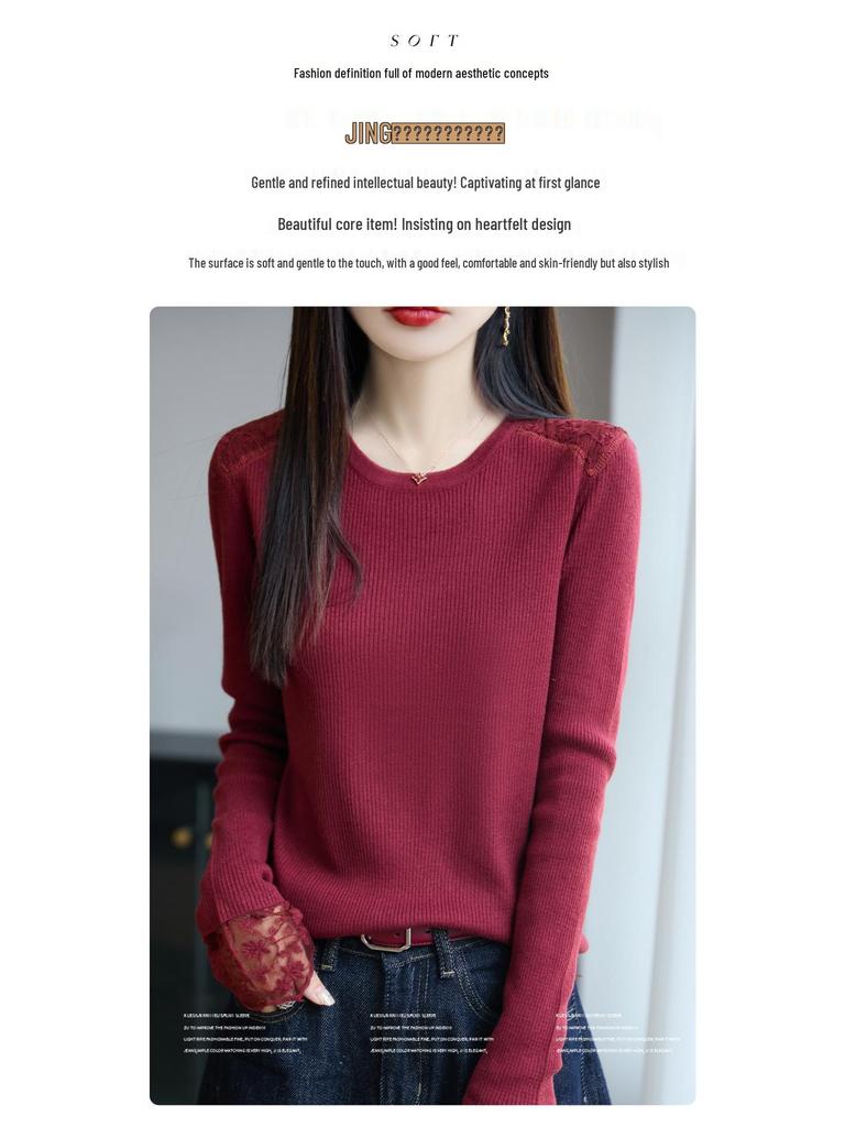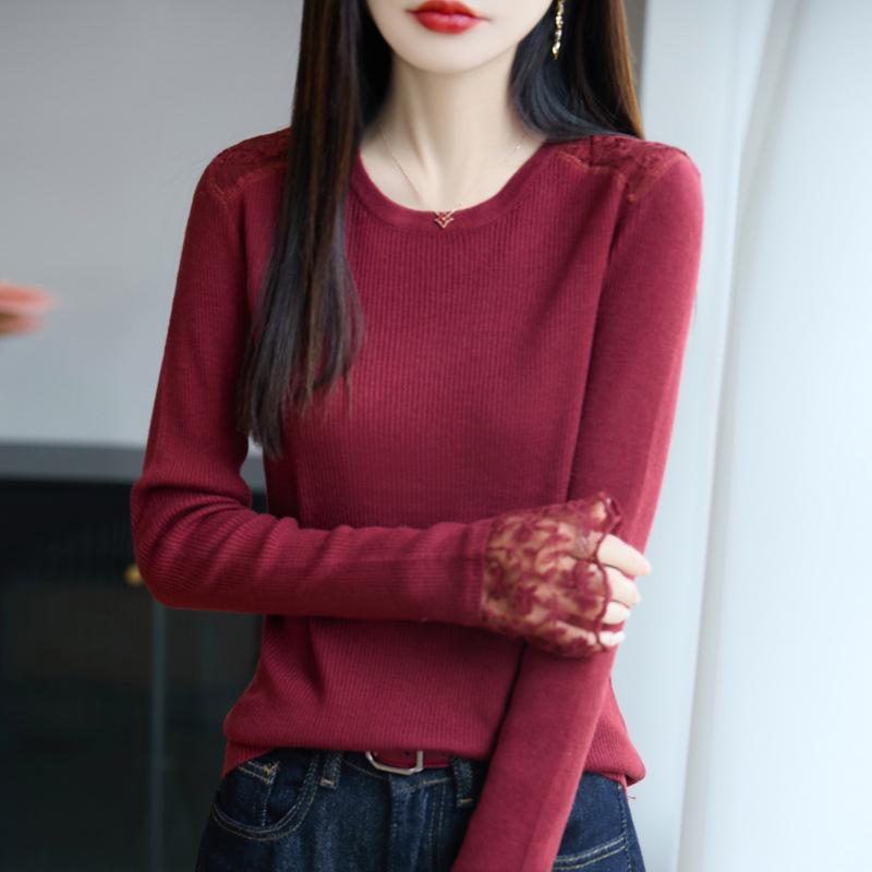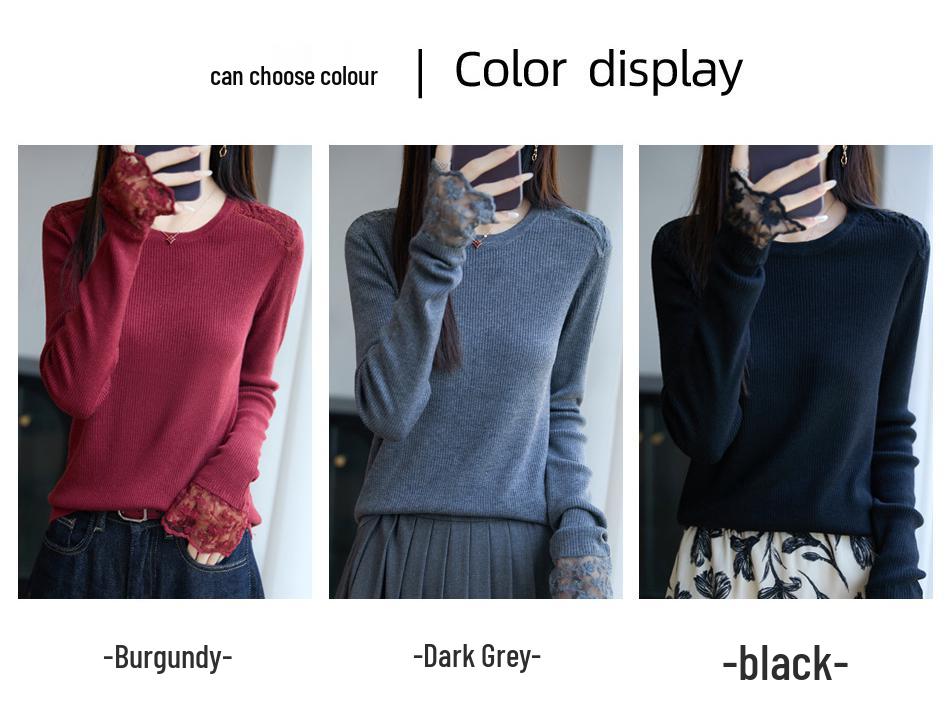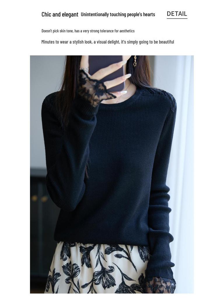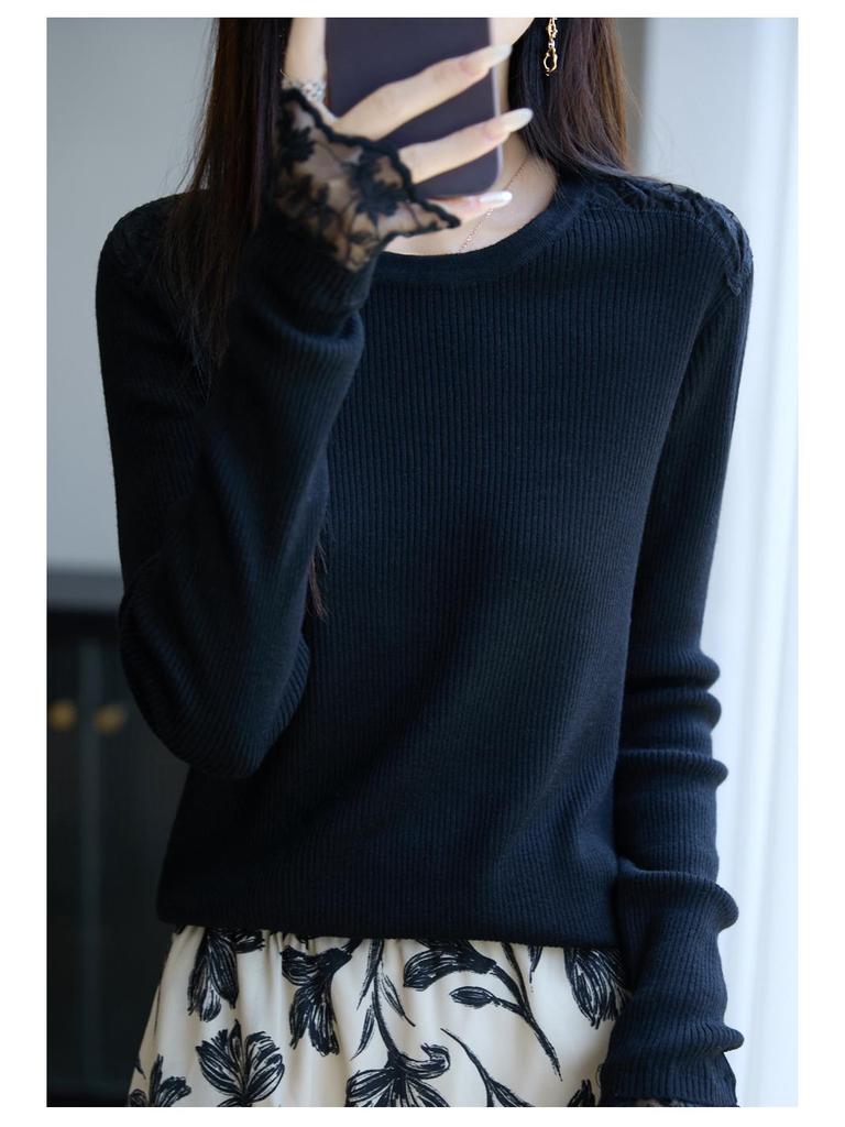 Черный кружевной лоскутный облегающий свитер: Женский вязаный топ с кружевной отделкой на осень/зиму