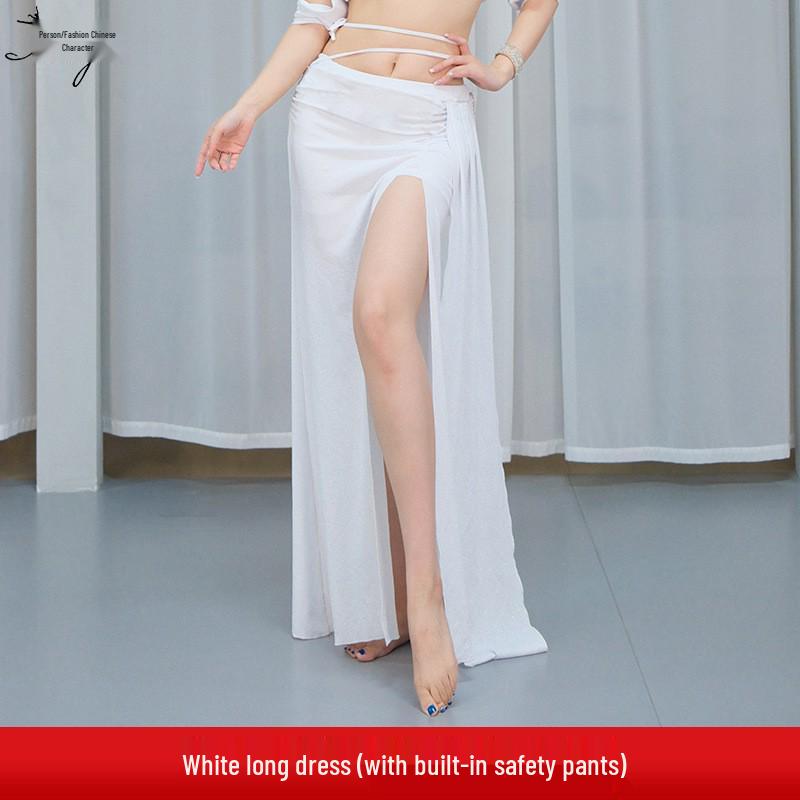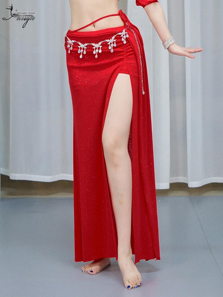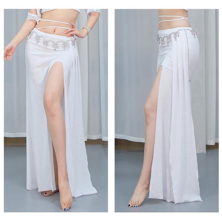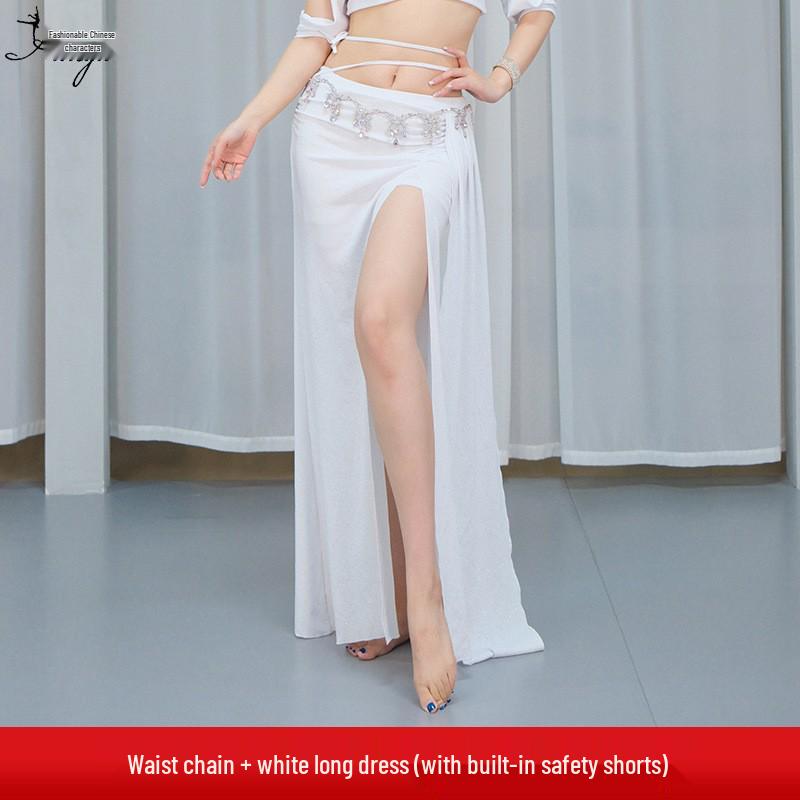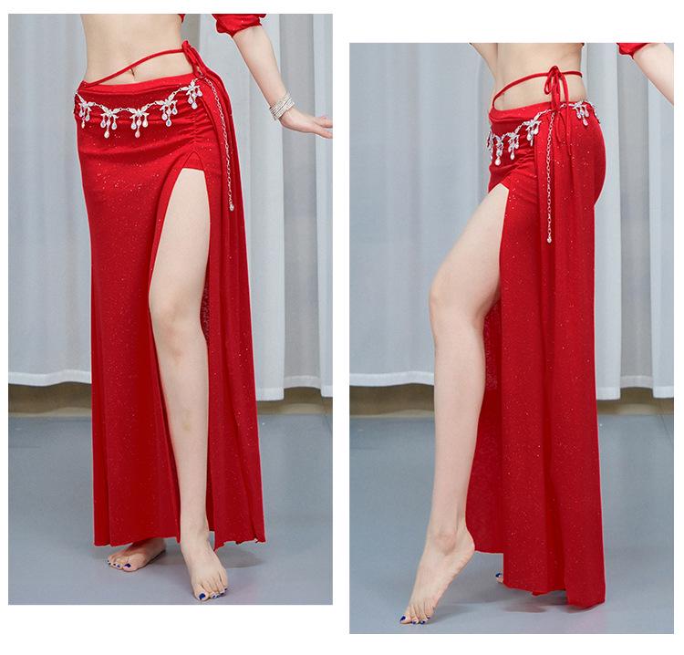 Комплект для тренировок танца живота в стиле феи Хуаю: Длинная юбка с разрезом и топ для восточного выступления.