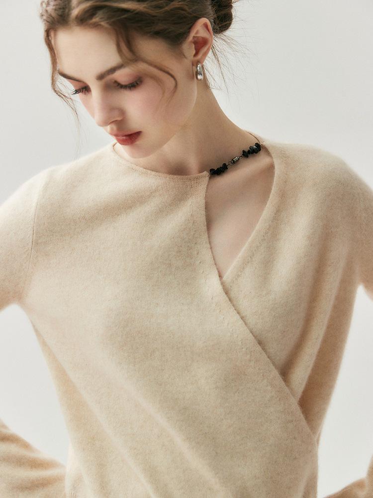 Женский асимметричный кашемировый свитер с перекрещенным воротником и подвернутыми манжетами – Элегантный вязаный базовый слой для осени/зимы — купить товар онлайн с бесплатной доставкой по всему миру!