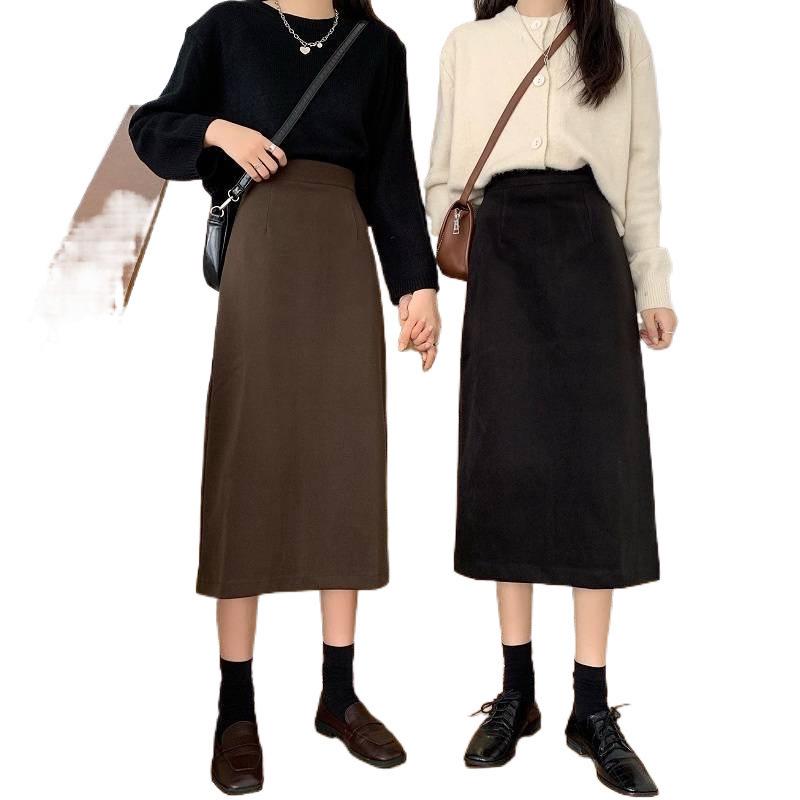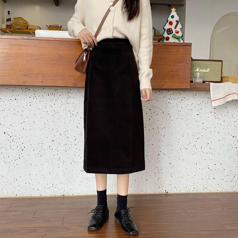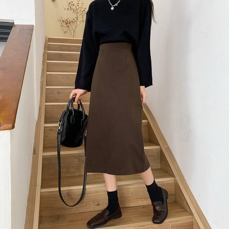 Осень/Зима 2025 Черная шерстяная юбка миди А-силуэта с высокой талией и стройнящим разрезом