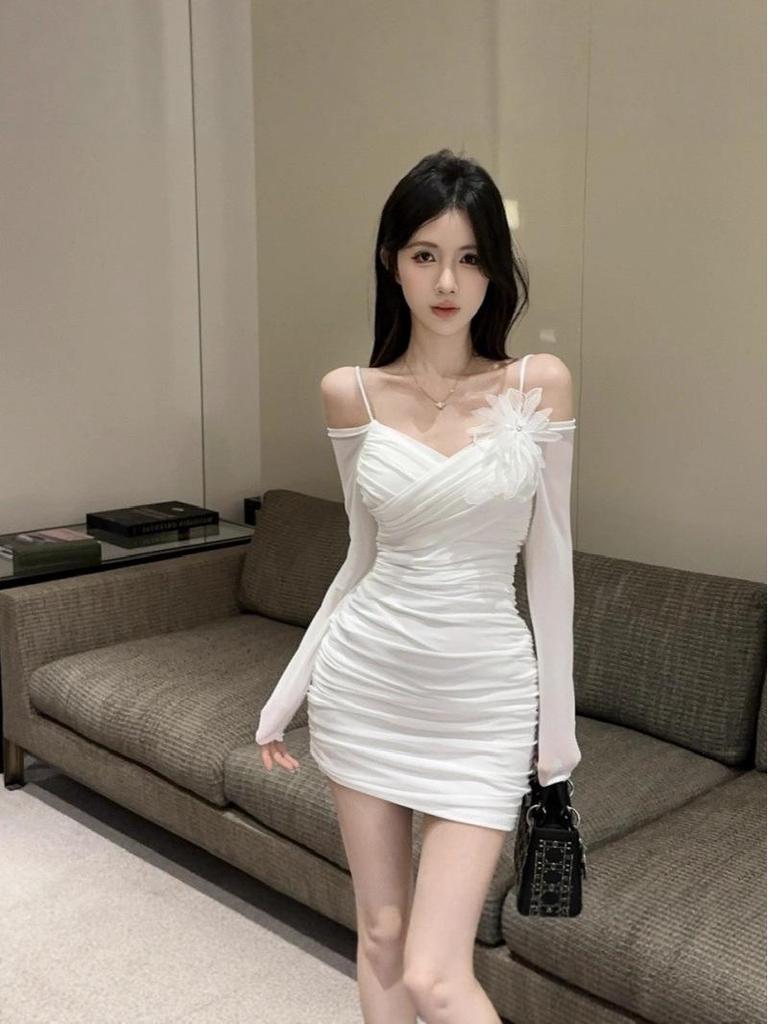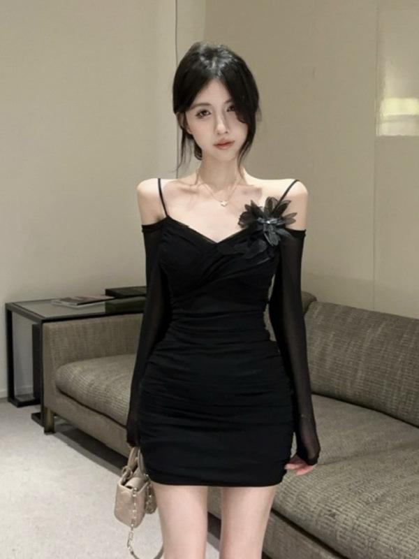 Реальное фото 9469 Женское клубное сексуальное облегающее платье из сетки с цветочной вставкой и бретелями-спагетти на одно плечо