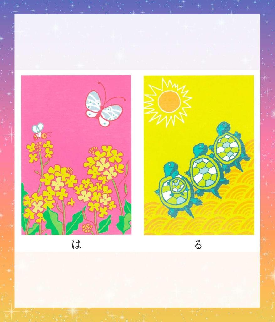 Изучение «Один иероглиф, один звук», которое добавляет глубокий смысл японскому пейзажу, красоте четырех времен года и отдельным звукам японских слов, являющихся частью этих занятий, состоит из 47 карточек в общей сложности, включая 46 звуков, начинающихся с а-и-у-э-о и звонких согласных.